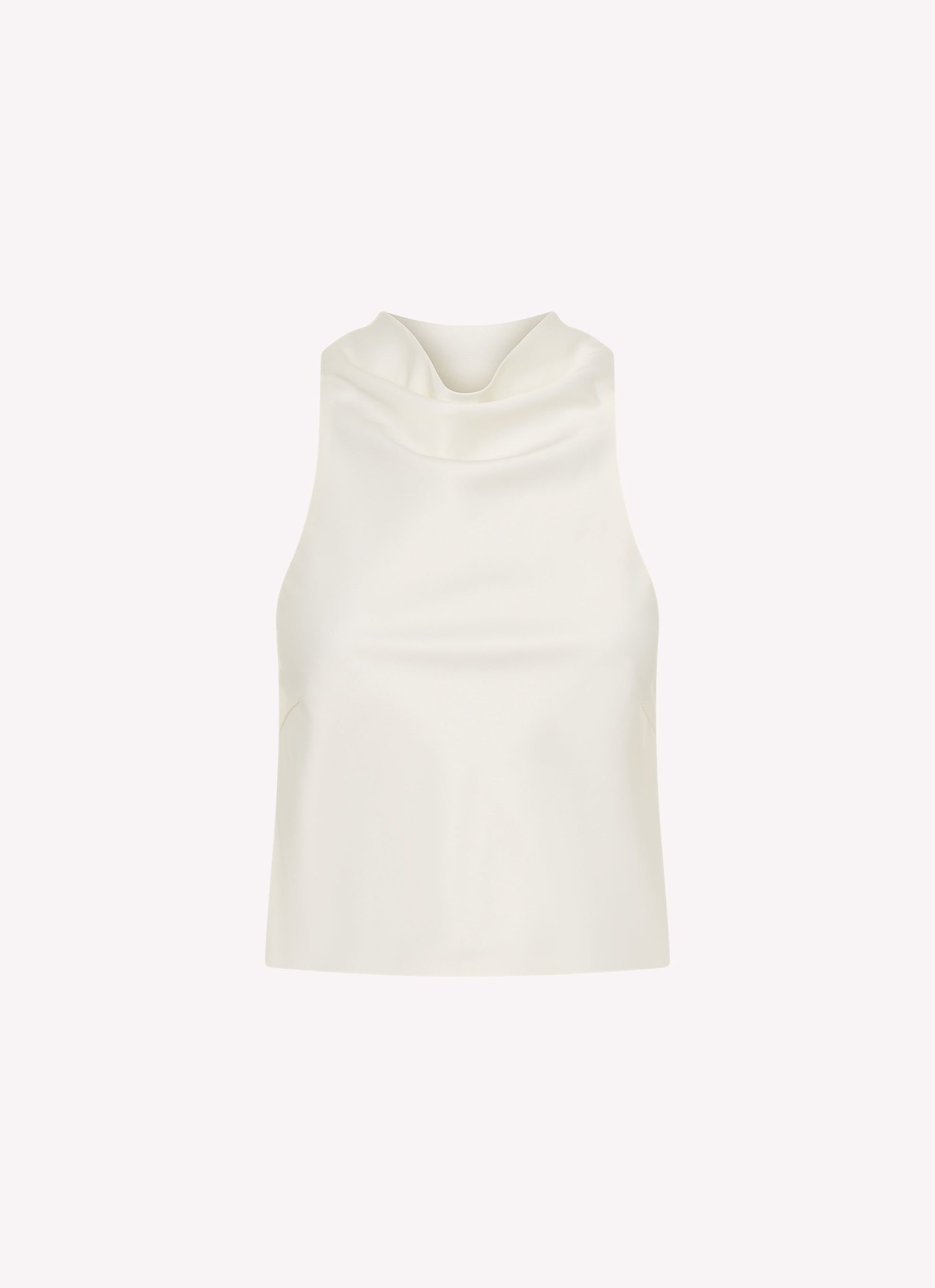 The Brookie Satin Top features a high neckline for an elegant look, with subtle side darts for a tailored fit. Its open back adds a striking contrast to the polished front design.