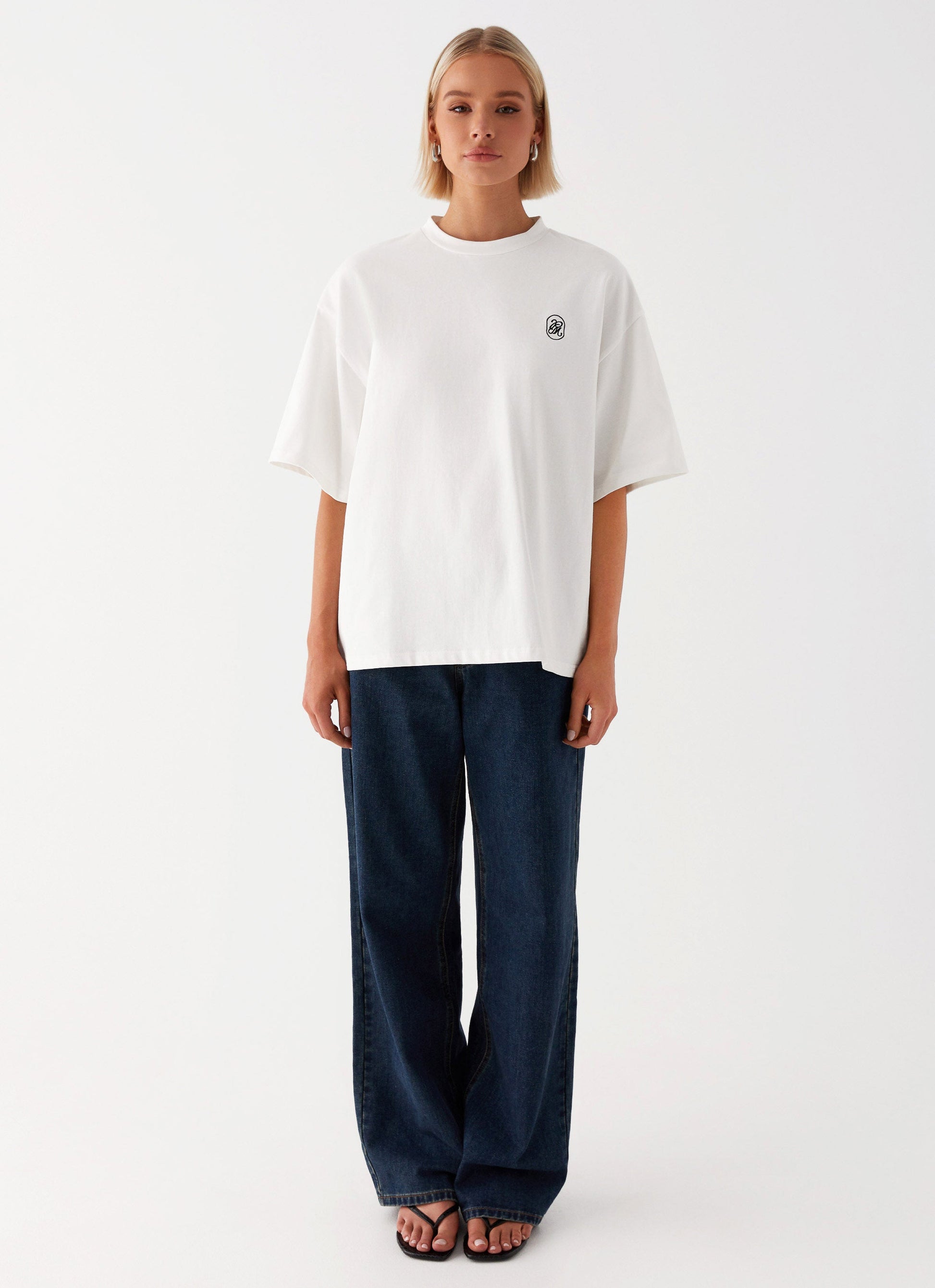 Embrace relaxed elegance with the Carefree Monogram T-Shirt. This oversized fit tee offers a round neckline and features a prominent monogram embroidery on the front, combining comfort with a touch of class.