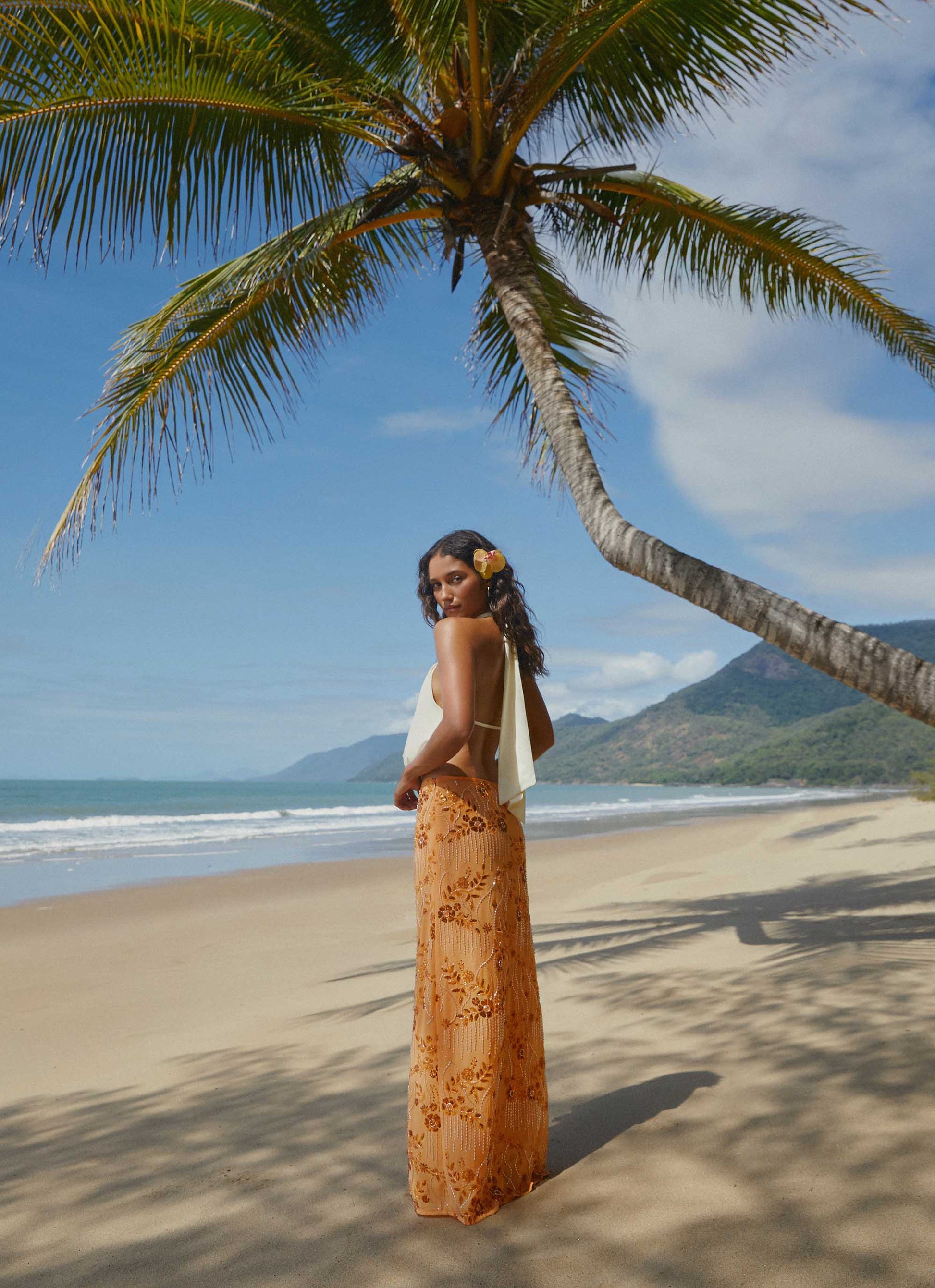 The Corinna Sequin Maxi Skirt offers sleek sparkle with a low-rise fit and shimmering beaded fabric. Perfect for pairing with a crop or matching top for high-impact glamour.