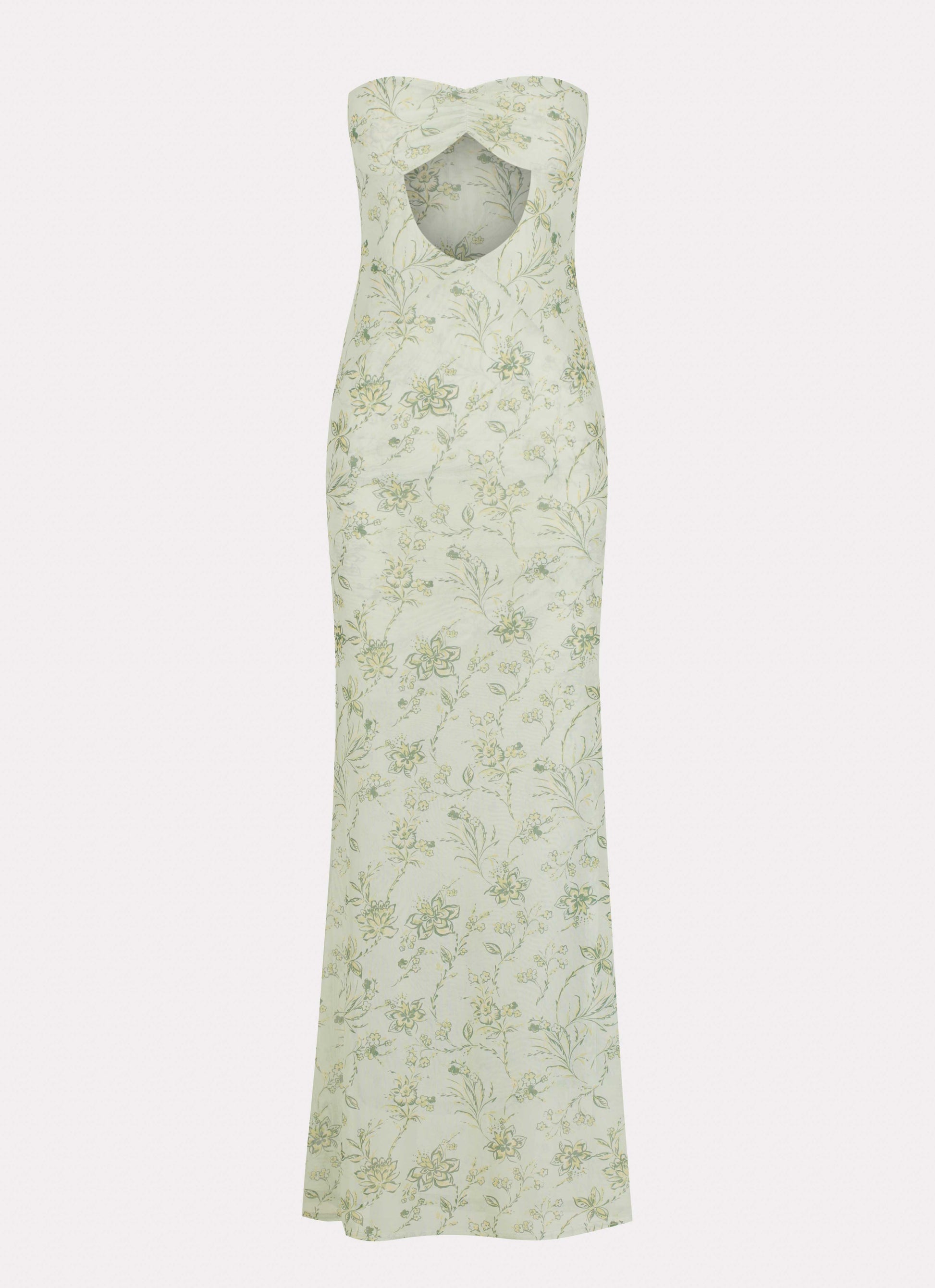 Embrace elegance with the Dearest Maxi Dress. Featuring a strapless neckline, ruched center bust, and captivating front cut-out detailing, this dress effortlessly blends sophistication with a touch of allure.