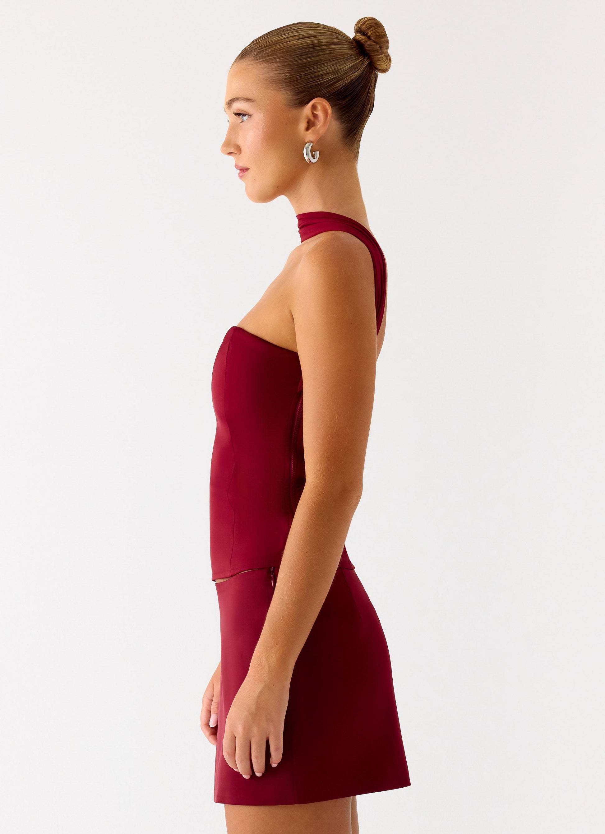 The Do It Again Top is a strapless corset-style piece with scarf detailing, fully lined for comfort and structure, finished with a side invisible zipper.