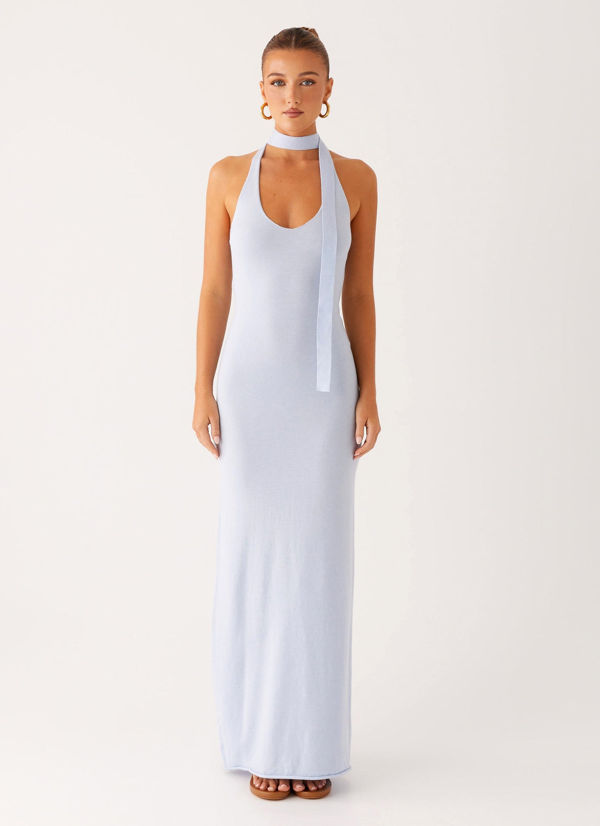 The Eddie Maxi Dress is effortlessly sleek in soft blue stretch knit. Designed with a body-skimming silhouette and underlining for a smooth fit, it’s made to move with you from slow afternoons to after-hours.