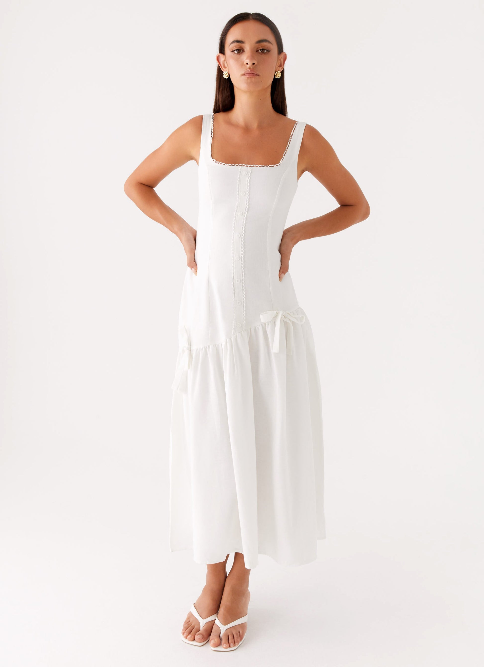 The Esmerelda Midi Dress is effortless elegance with a vintage edge. Featuring a clean square neckline and a relaxed dropped waist, it drapes beautifully for a look that's both refined and undone.