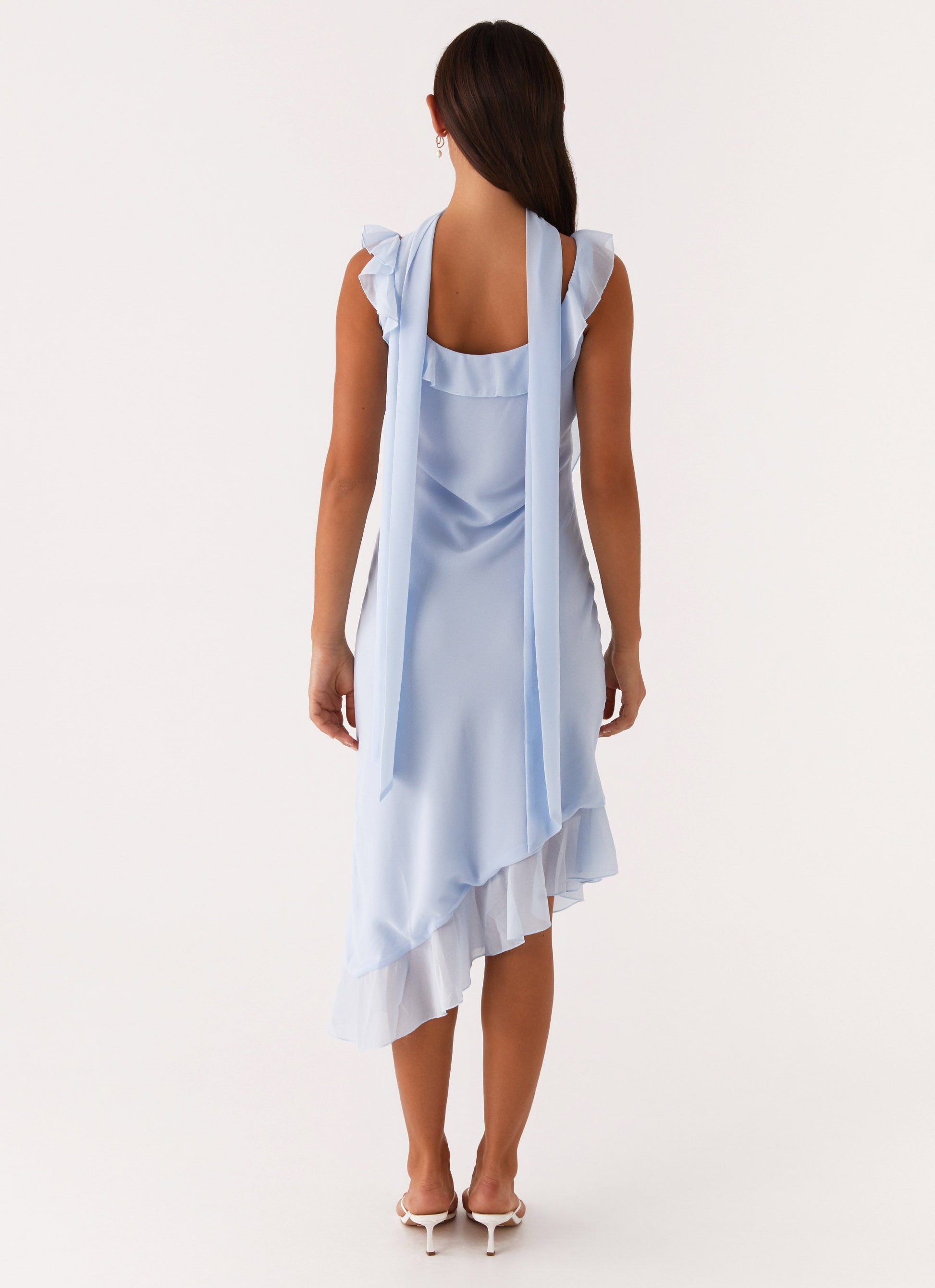 Capture the essence of effortless elegance with the Fariday Midi Dress. Featuring a romantic ruffled neckline and delicate scarf detailing, this dress is adorned with stunning front flow embellishments.