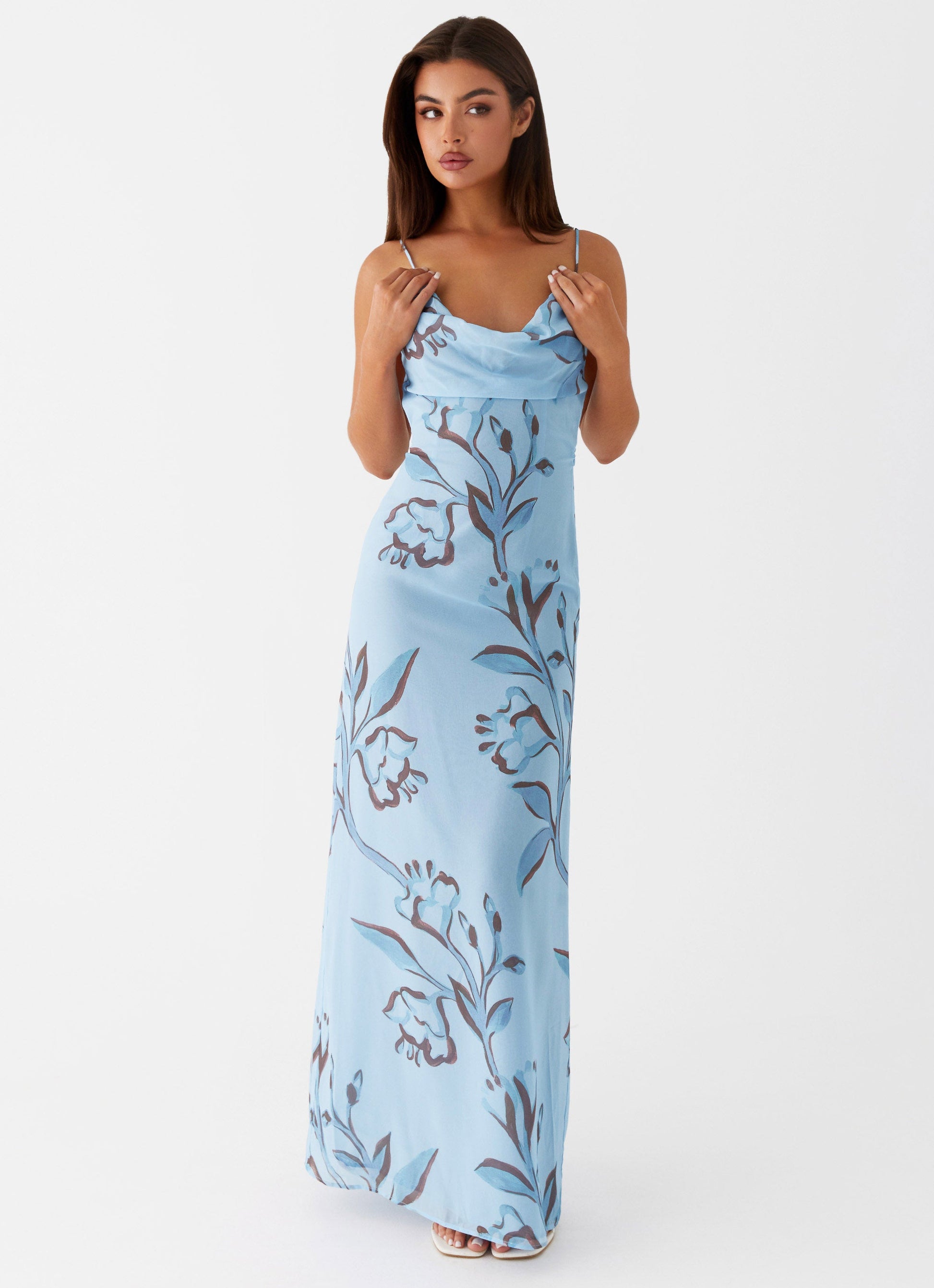 Meet your new evening essential: the Felicia Daisy Maxi Dress. Featuring a sultry cowl neckline, an alluring open back, and delicate thin straps, this dress is designed for nights that turn into mornings.