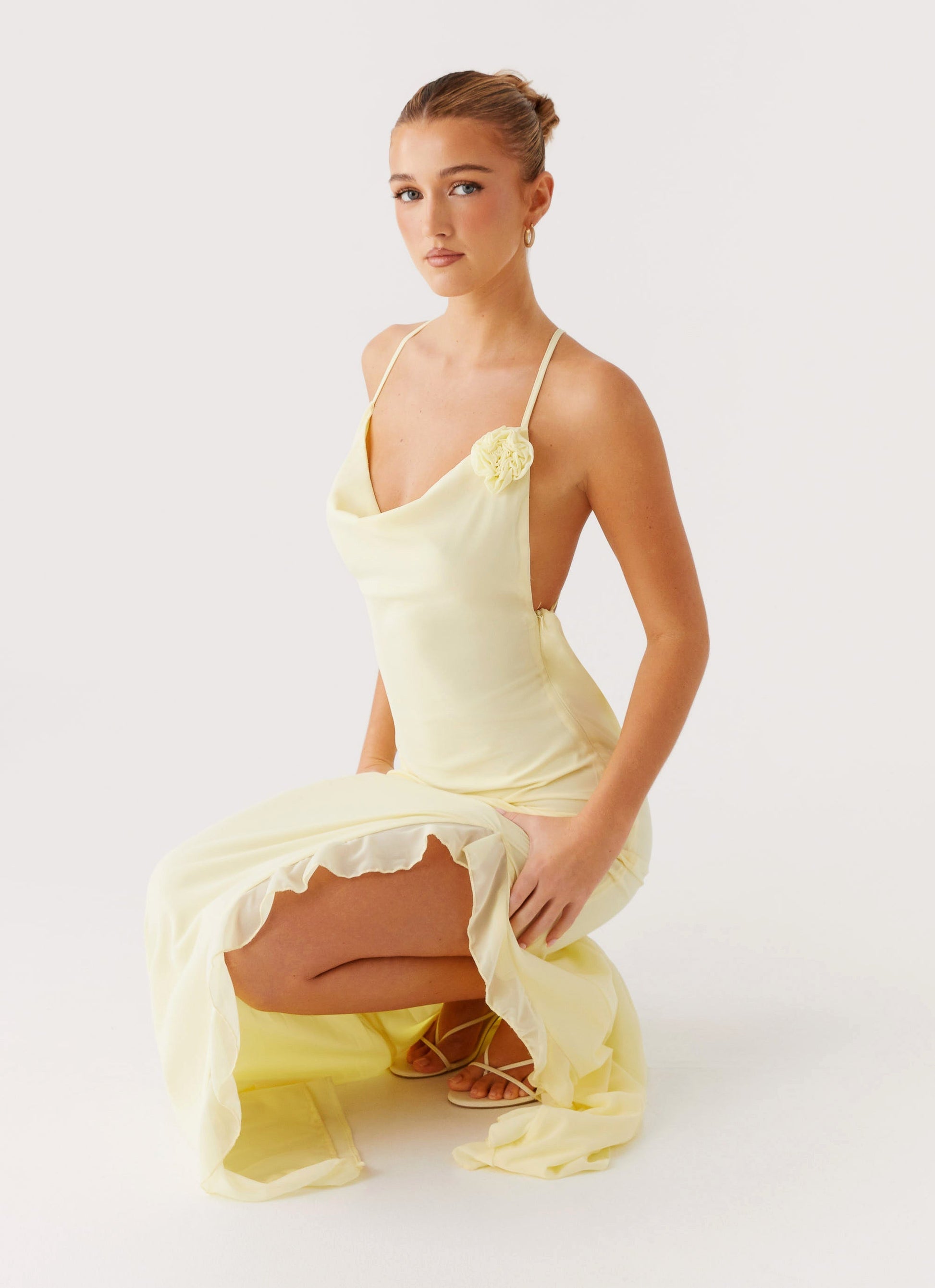 The First Class Maxi Dress is your golden ticket to the night. Featuring a low front cowl neckline and delicate flower embellishment, this maxi silhouette flows effortlessly with front ruffle split detailing. Thin straps cross at the open back for an adjustable fit—made for midnight entrances and dancefloor exits.