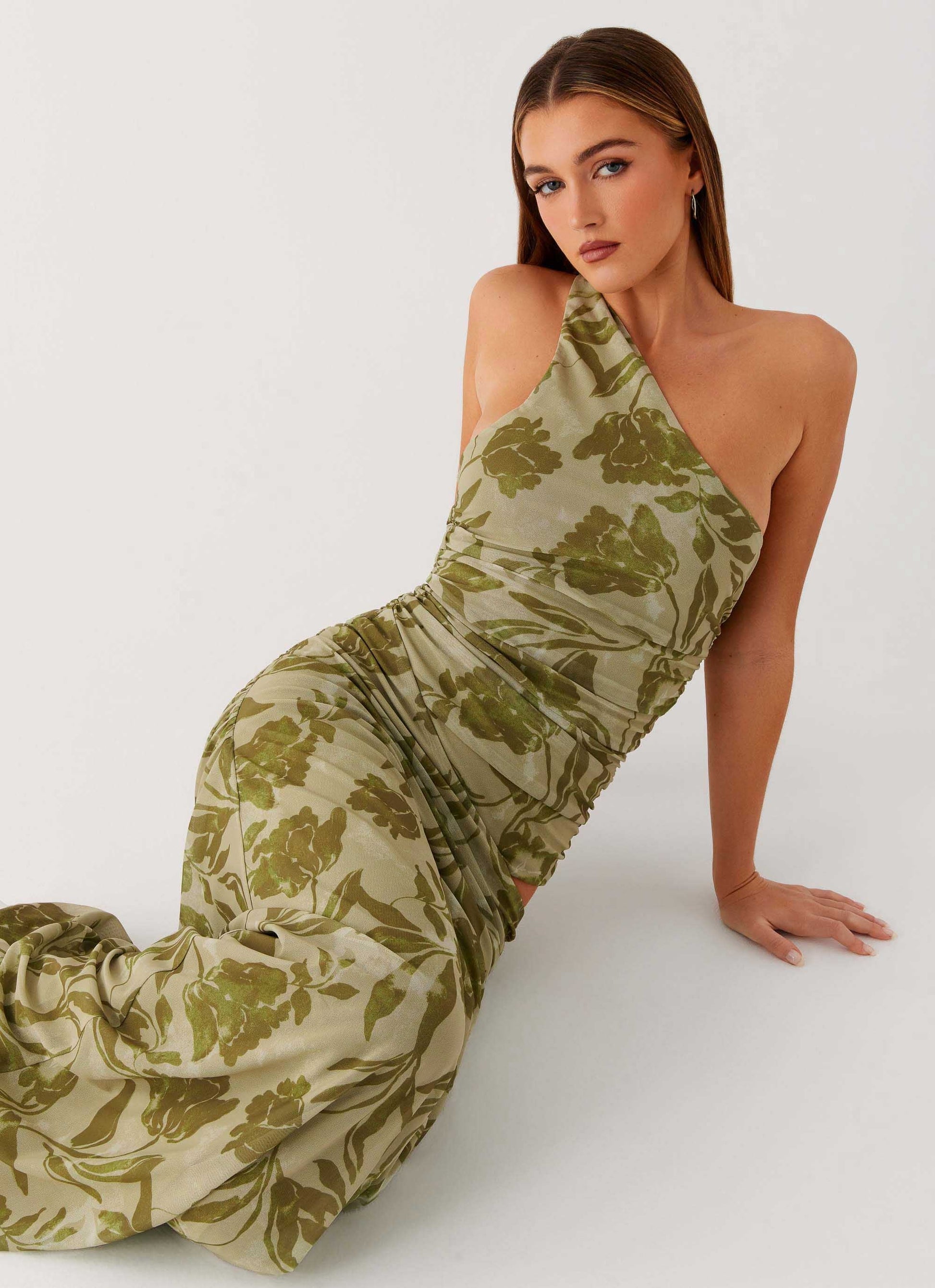The Georgiana Maxi Dress features a maxi length with an asymmetrical neckline and ruched sides for a flattering silhouette. Crafted from stretch mesh and fully lined, it showcases an exclusive print that adds a unique touch to this elegant design.