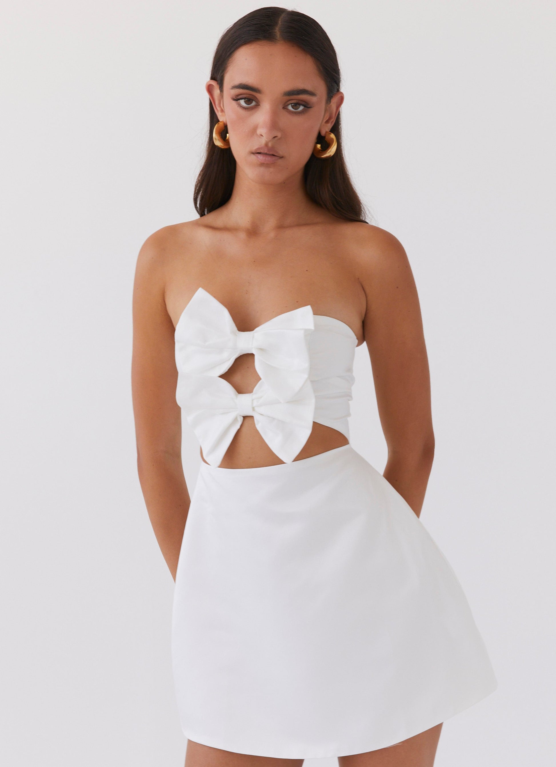 The Girl Crush Bow Mini Dress is party perfection. This beautiful design is strapless with a fitted bodice and flirty, slightly flared skirt and dramatic bows to finish the look.