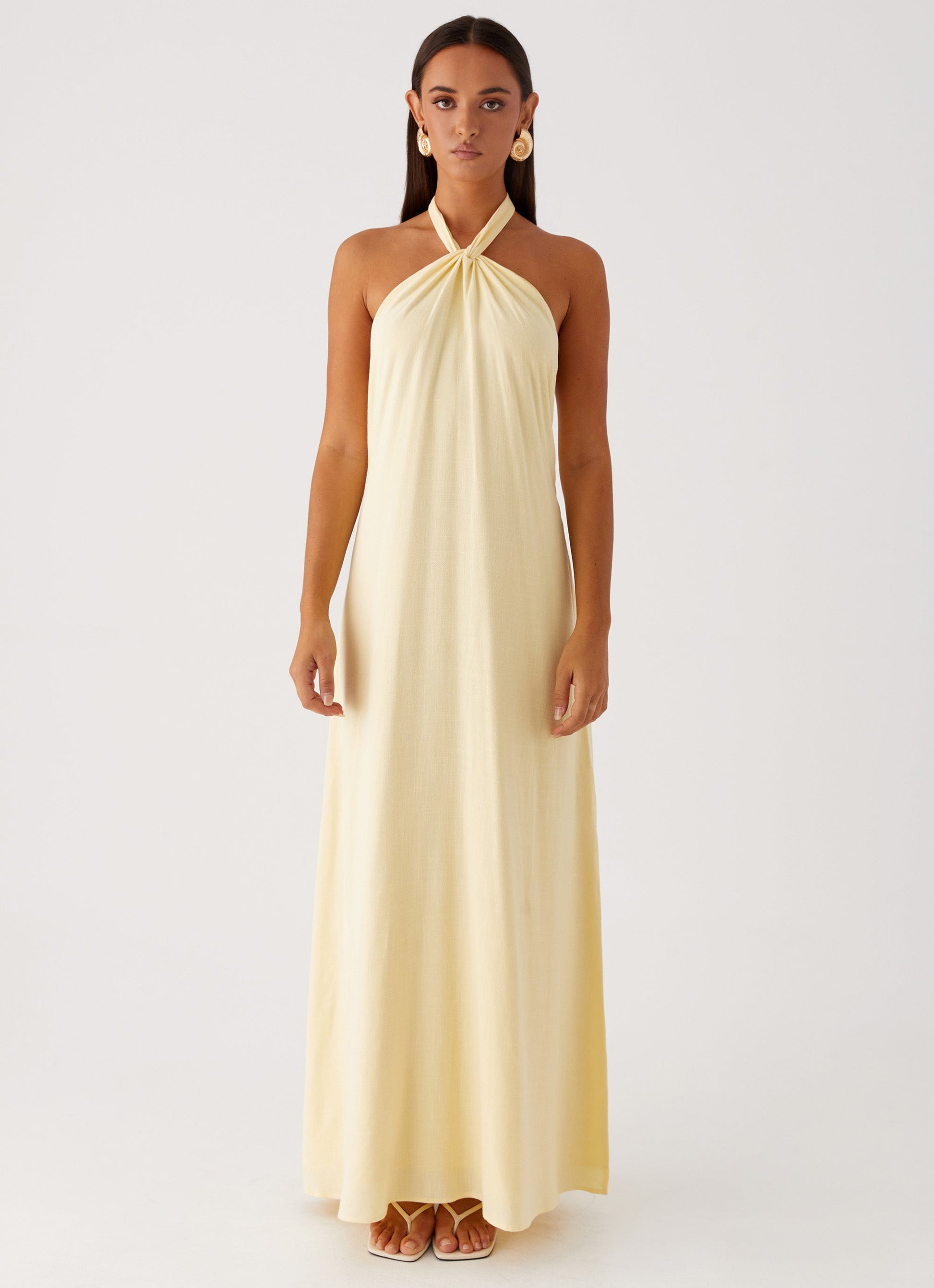 Shine bright in the Golden Child Linen Maxi Dress. The halterneck design and open back create a stunning silhouette, Perfect for making a statement under the golden skies.
