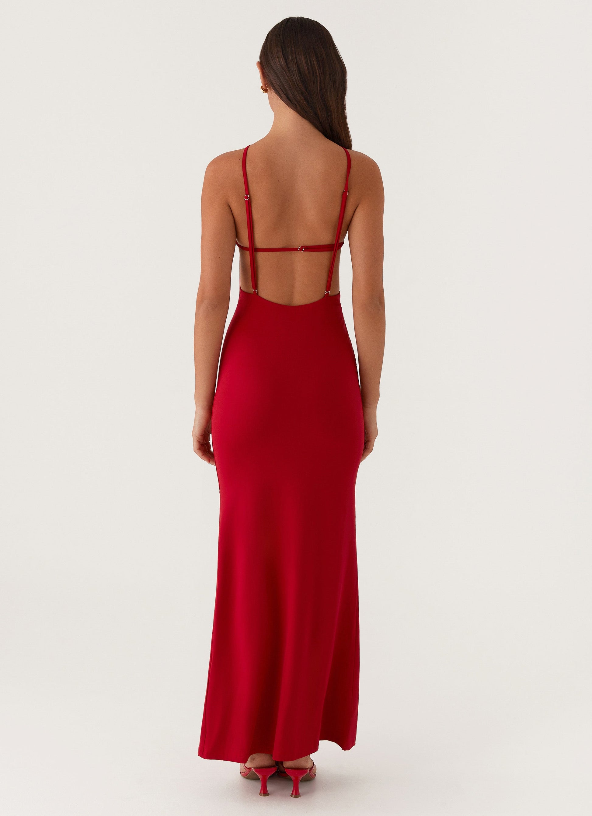 The Grow Together Maxi Dress features an open back, stretch jersey fabric for a comfortable, flattering fit, and is fully self-lined for added structure and support. Ideal for an elegant and effortless look.