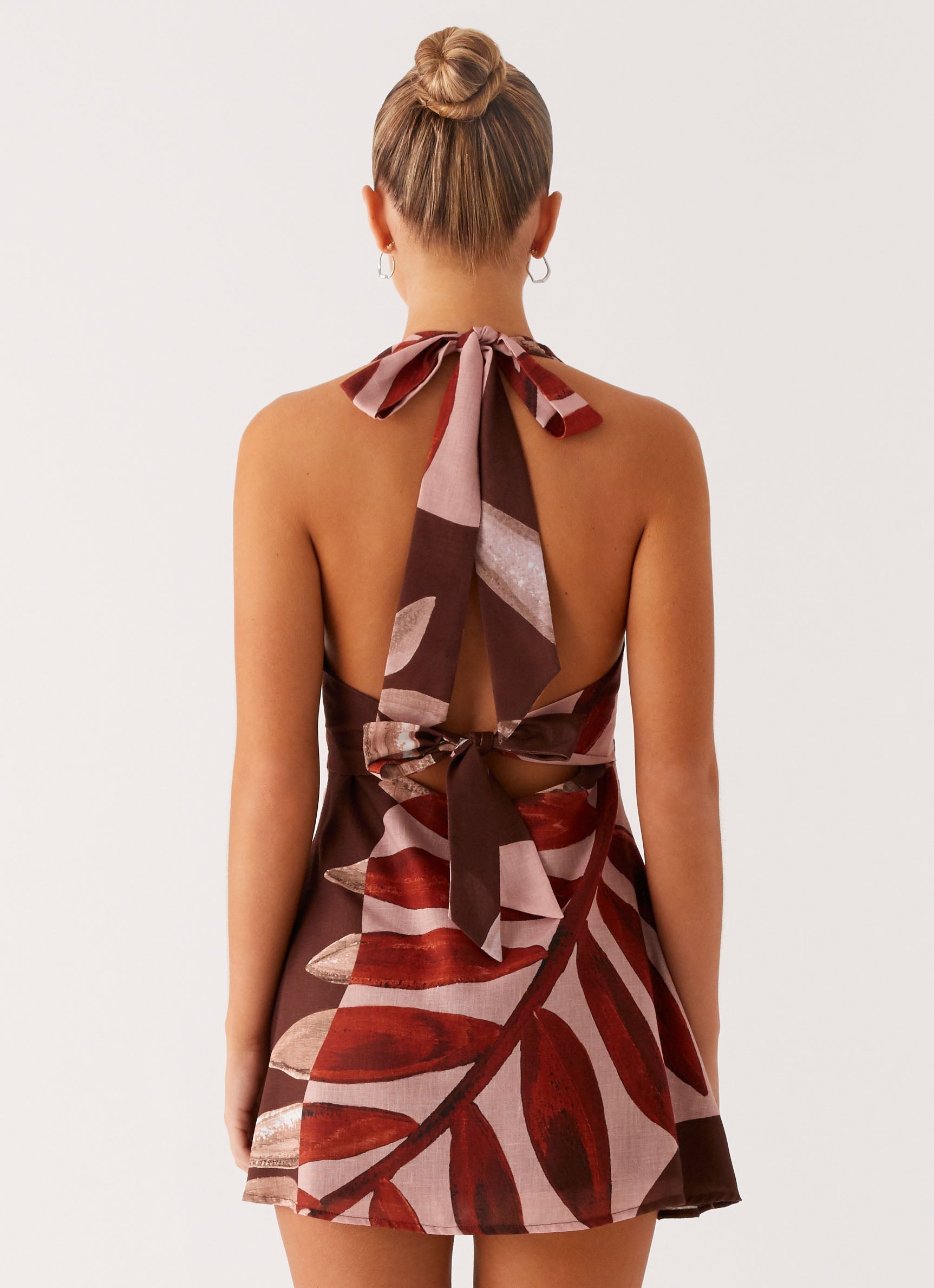The Heavy Hearted Linen Mini Dress in Cinnamon Palm features a flattering V neckline with ruched underbust detailing for a fitted silhouette. It’s designed with a neck tie strap and back tie, highlighting a low back and exclusive print, making it a stylish and unique mini dress choice.