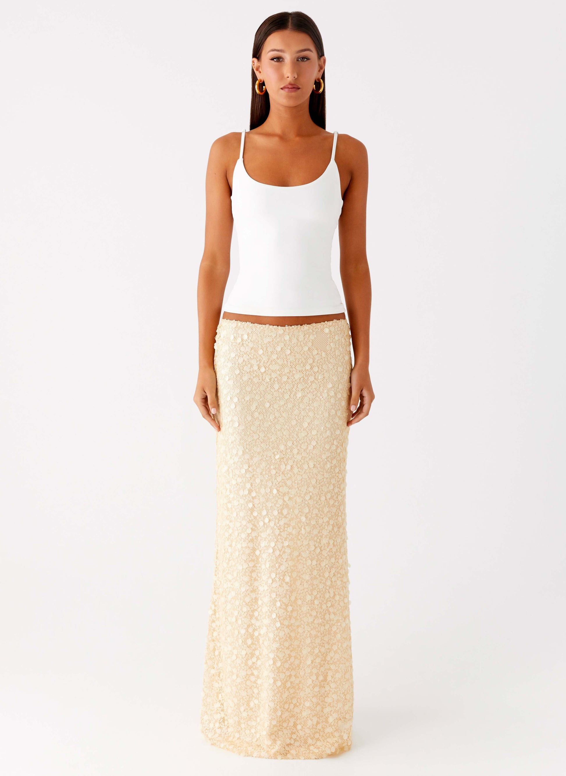 The Honestly Sequin Maxi Skirt glimmers with every step from golden hour through nightfall. Featuring a low rise silhouette and stretch sequins material, this maxi skirt combines effortless glamour with comfortable fit thanks to its elasticated waistband. Fully lined for smooth wear, it’s your statement piece for cocktail parties and beyond.