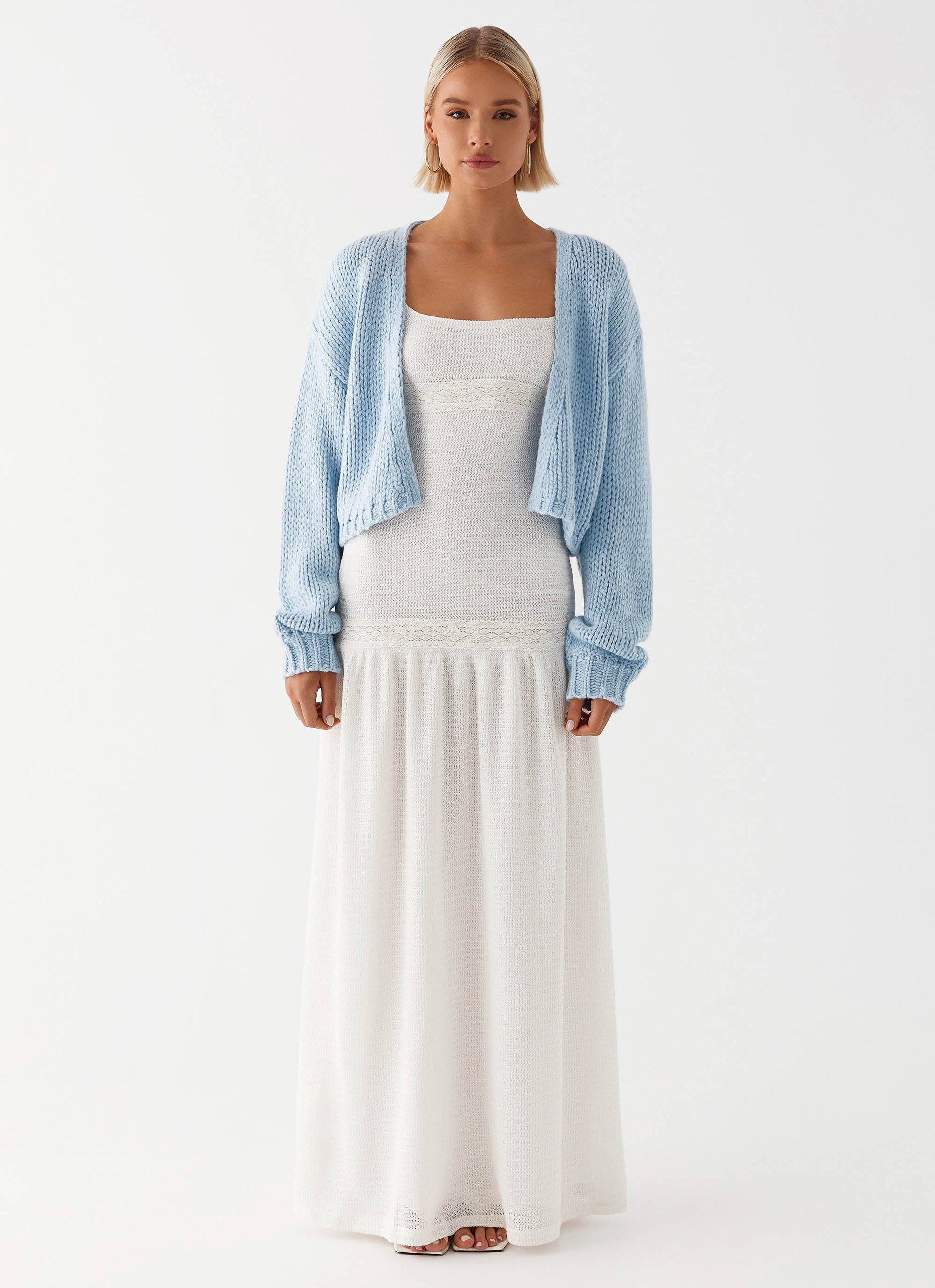 Wrap up in effortless style with the Jasleen Knit Cardigan. Its oversized fit and balloon cuffs create a relaxed silhouette, while the chunky knit ensures cozy comfort. Perfect for those balmy nights or adding a touch of laid-back chic to your look.