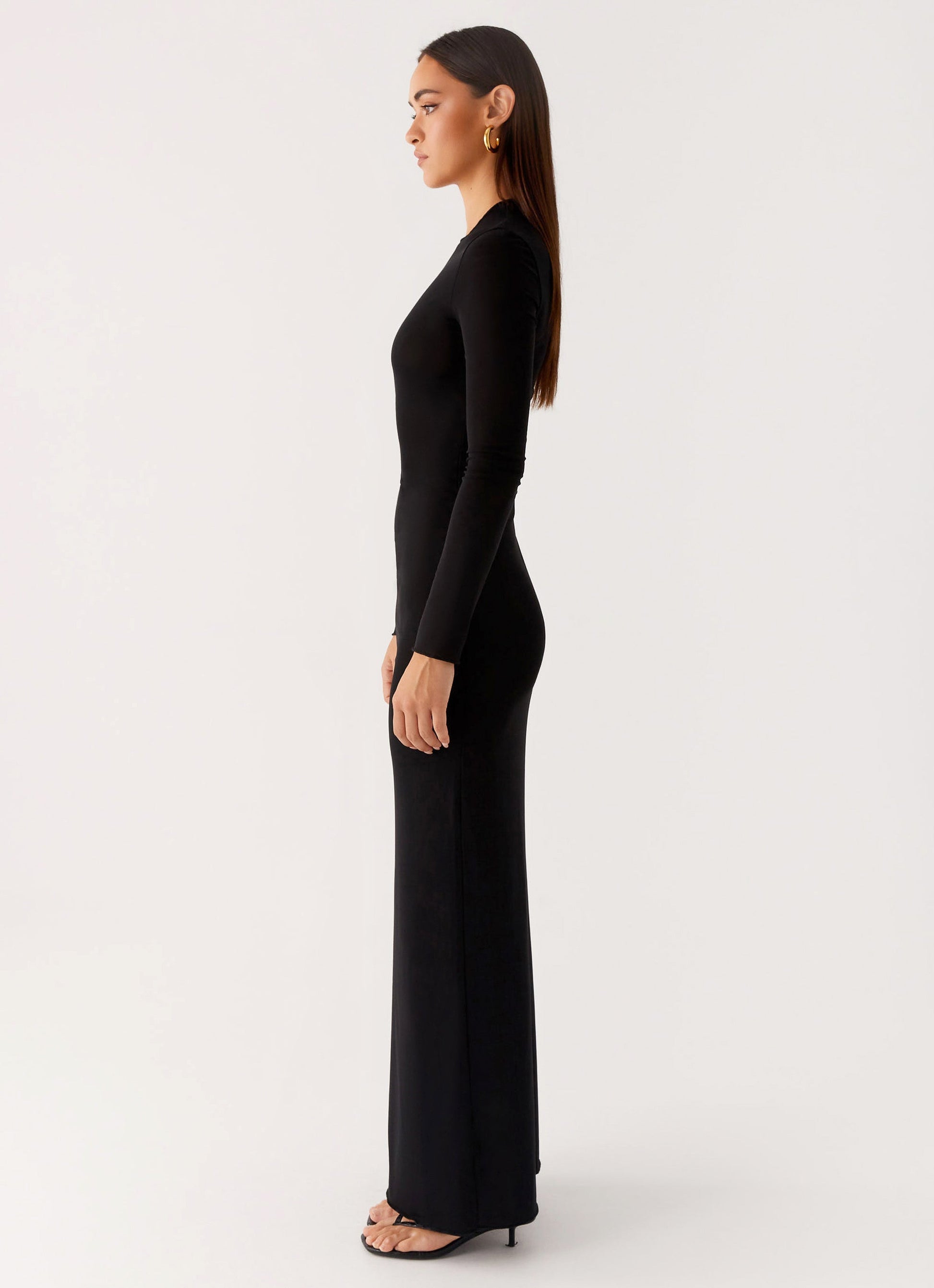 The Kamora Maxi Dress is a timeless piece with long sleeves and a high neckline, offering elegant coverage and a flattering silhouette. Perfect for evenings that call for something sleek and sophisticated.