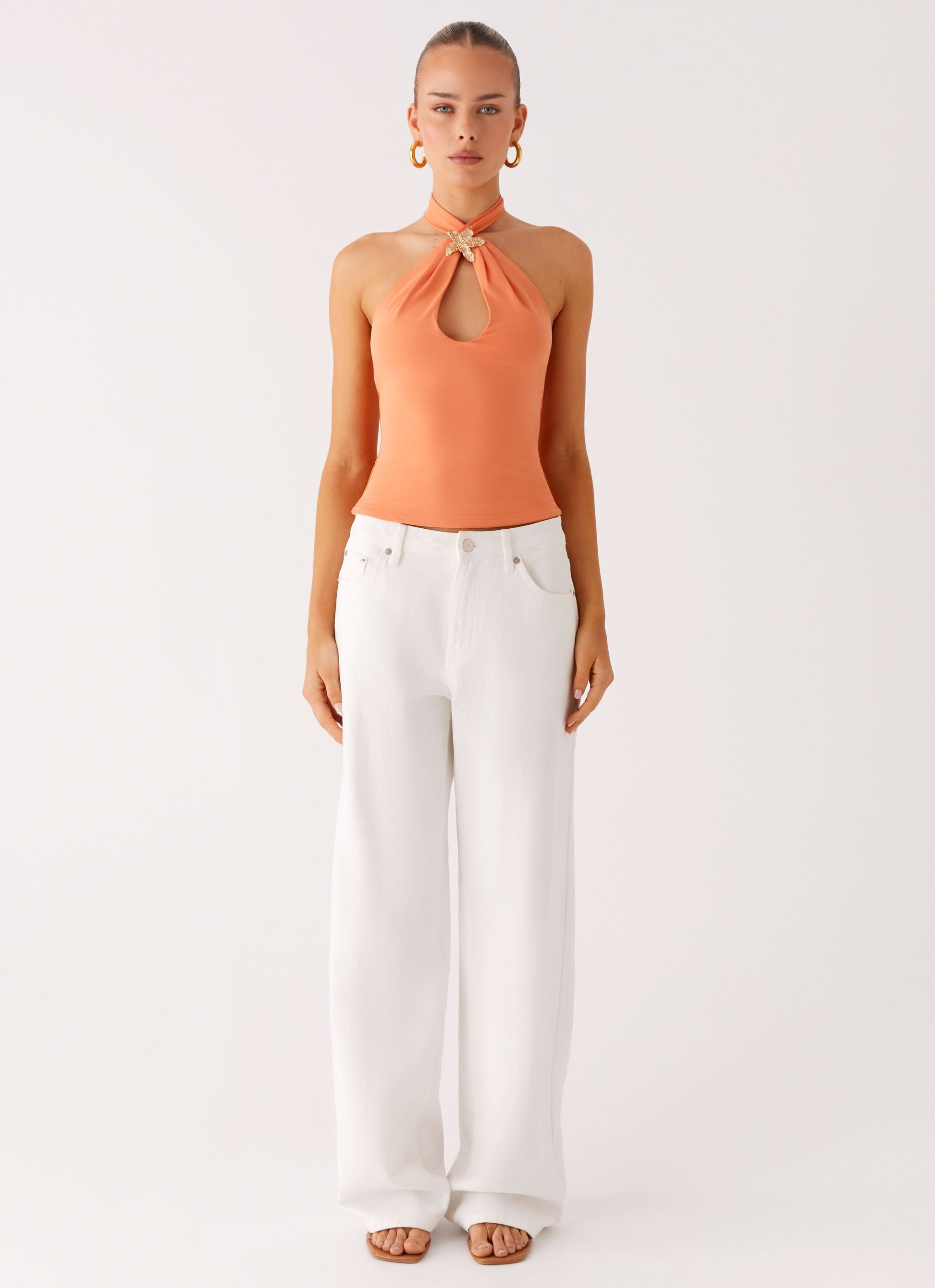 The Kirra Halter Top is crafted for nights that come alive from sunset to sundown. Featuring a halter neckline with a front keyhole cutout and a detachable metal embellishment, this stretch jersey top is self-lined and finished with a thick neck tie strap for a secure, stylish fit.