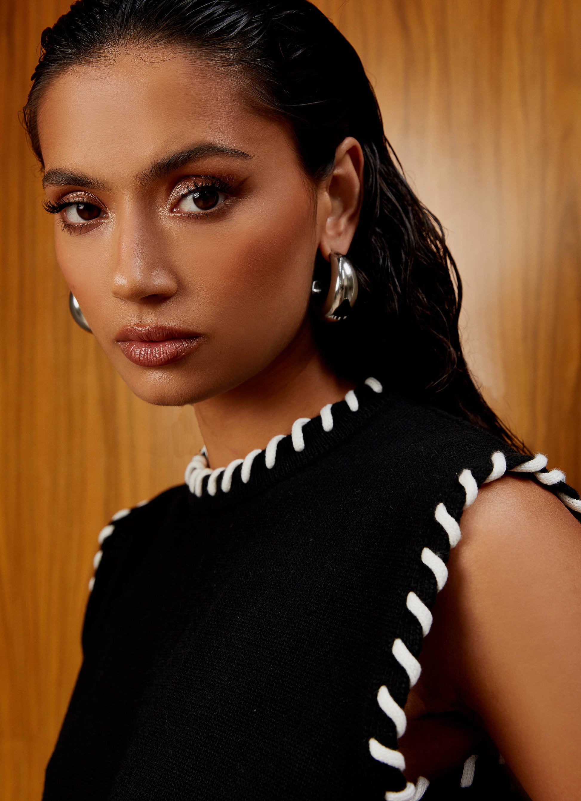 Introducing our Let's Get Loud Knit Top. With its contrast white binding detail and oversized fit, this top embodies the essence of twilight allure.