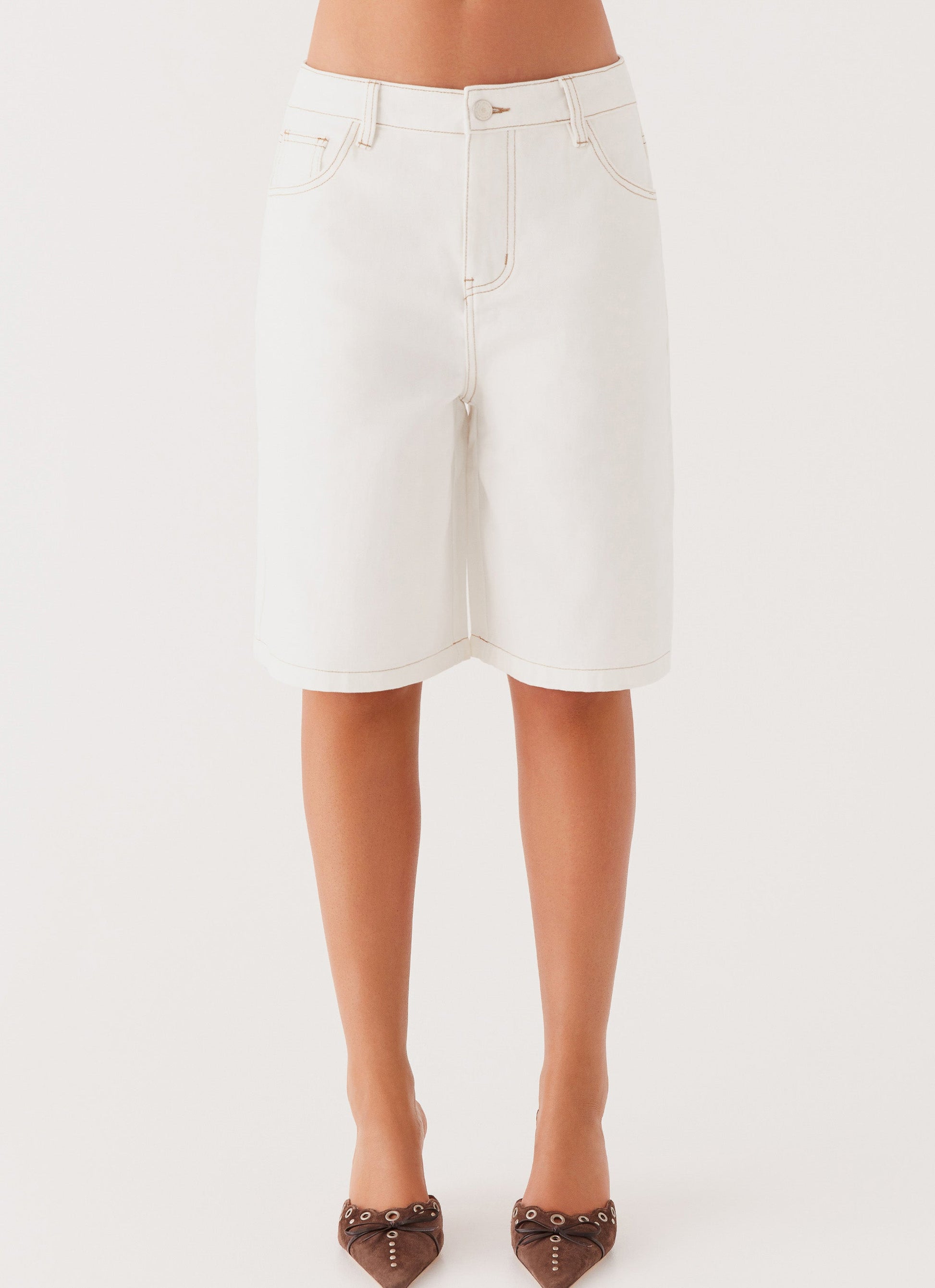 Introducing Lottie Low Rise Jorts. With a low-rise fit that echoes the laid-back vibes of golden sunsets and balmy evenings, these white jorts are the epitome of evening allure.