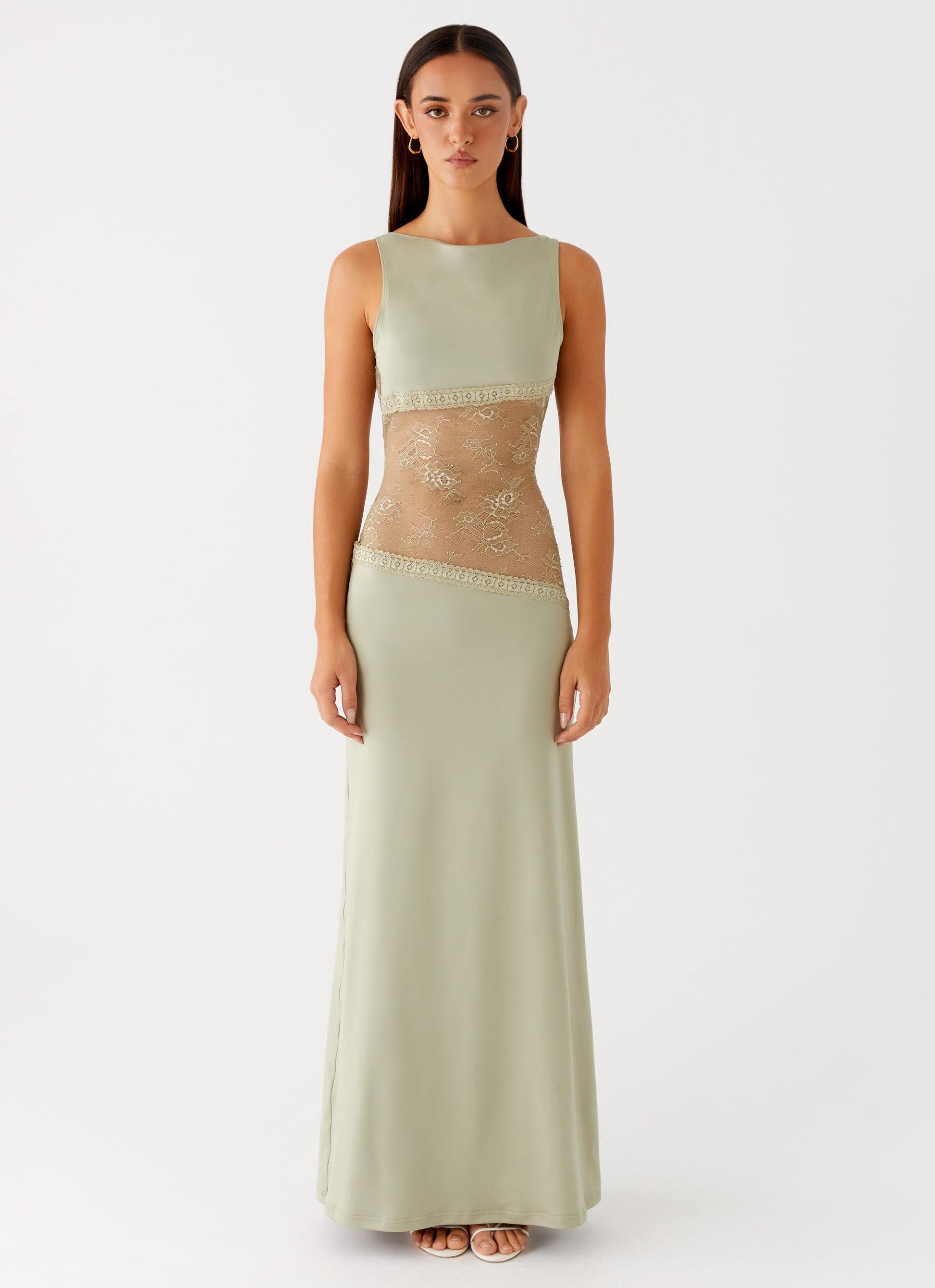 The Lucinda Maxi Dress is a romantic blend of stretch jersey and lace, with a semi-sheer waist and open back cut-out. A high neckline and body-skimming silhouette complete this elegant statement piece.