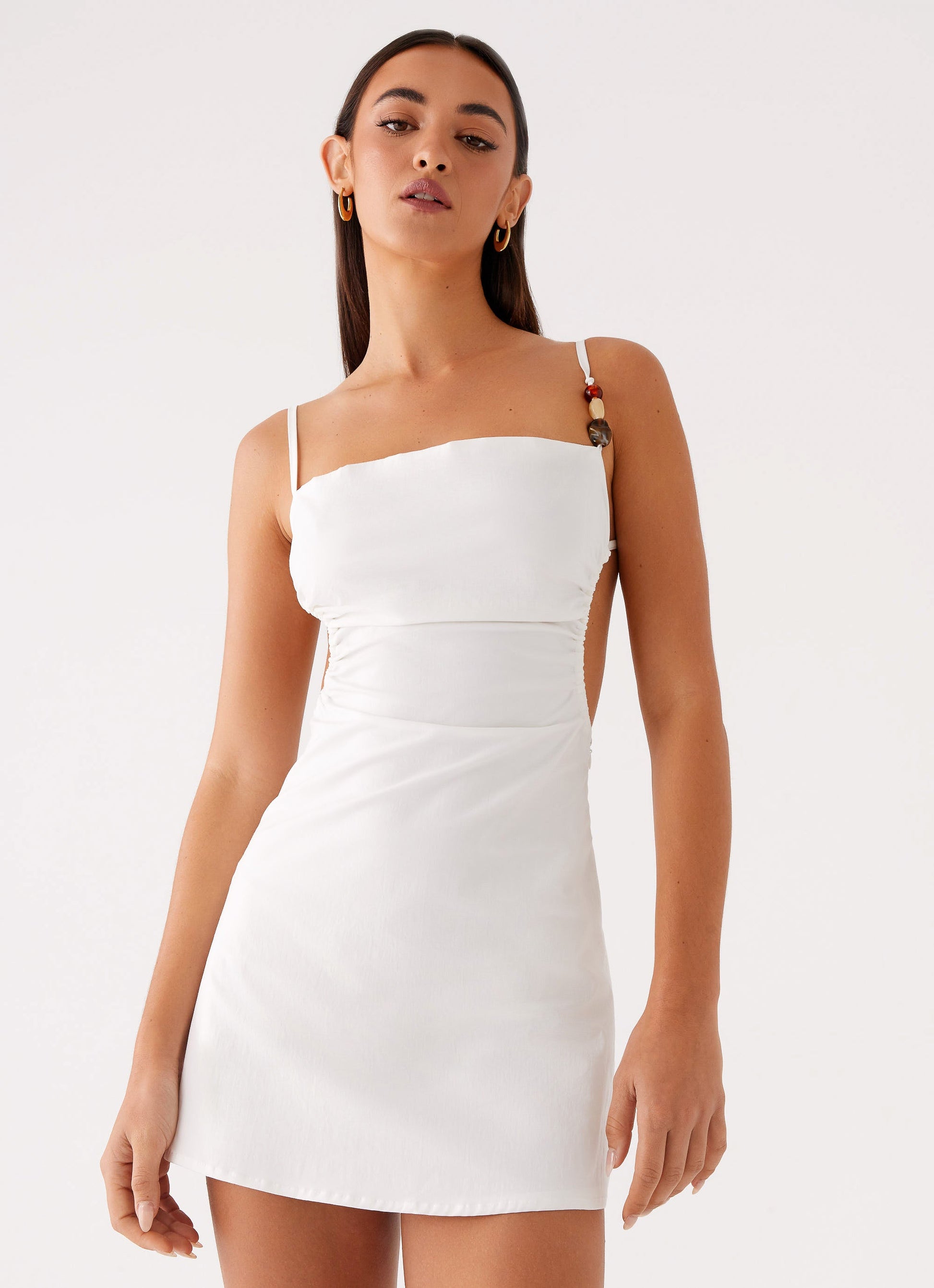 The Marlon Mini Dress features a mini length with a straight neckline and ruched side detailing. It has an open back finished with a delicate back tie for a flattering and elegant look.