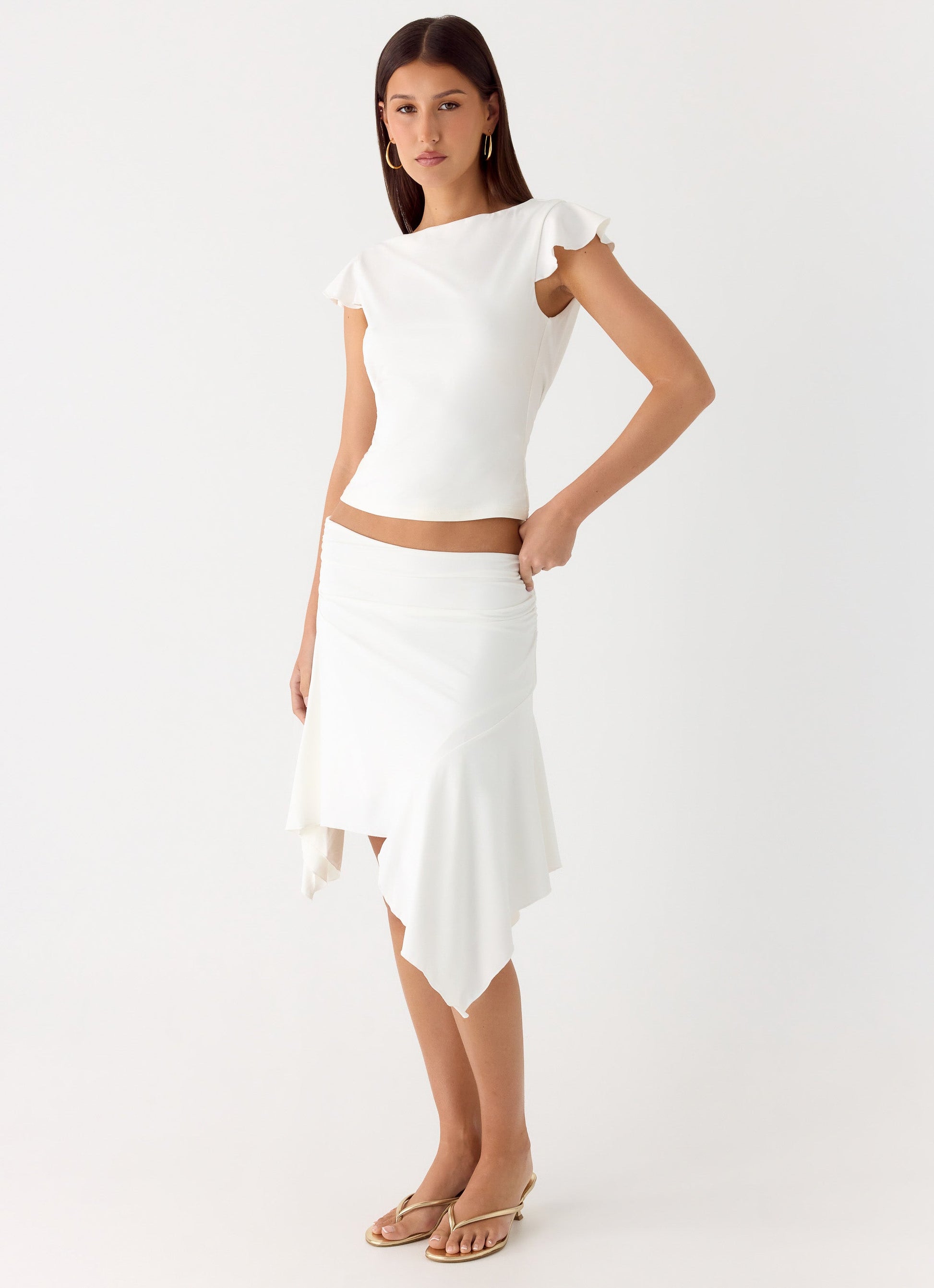 The Maxina Asymmetrical Midi Skirt is a chic, contemporary piece perfect for pairing with your favourite tops. Featuring a low-rise waist, stretch jersey fabric, and an asymmetrical hemline, this fully lined skirt offers both style and comfort.