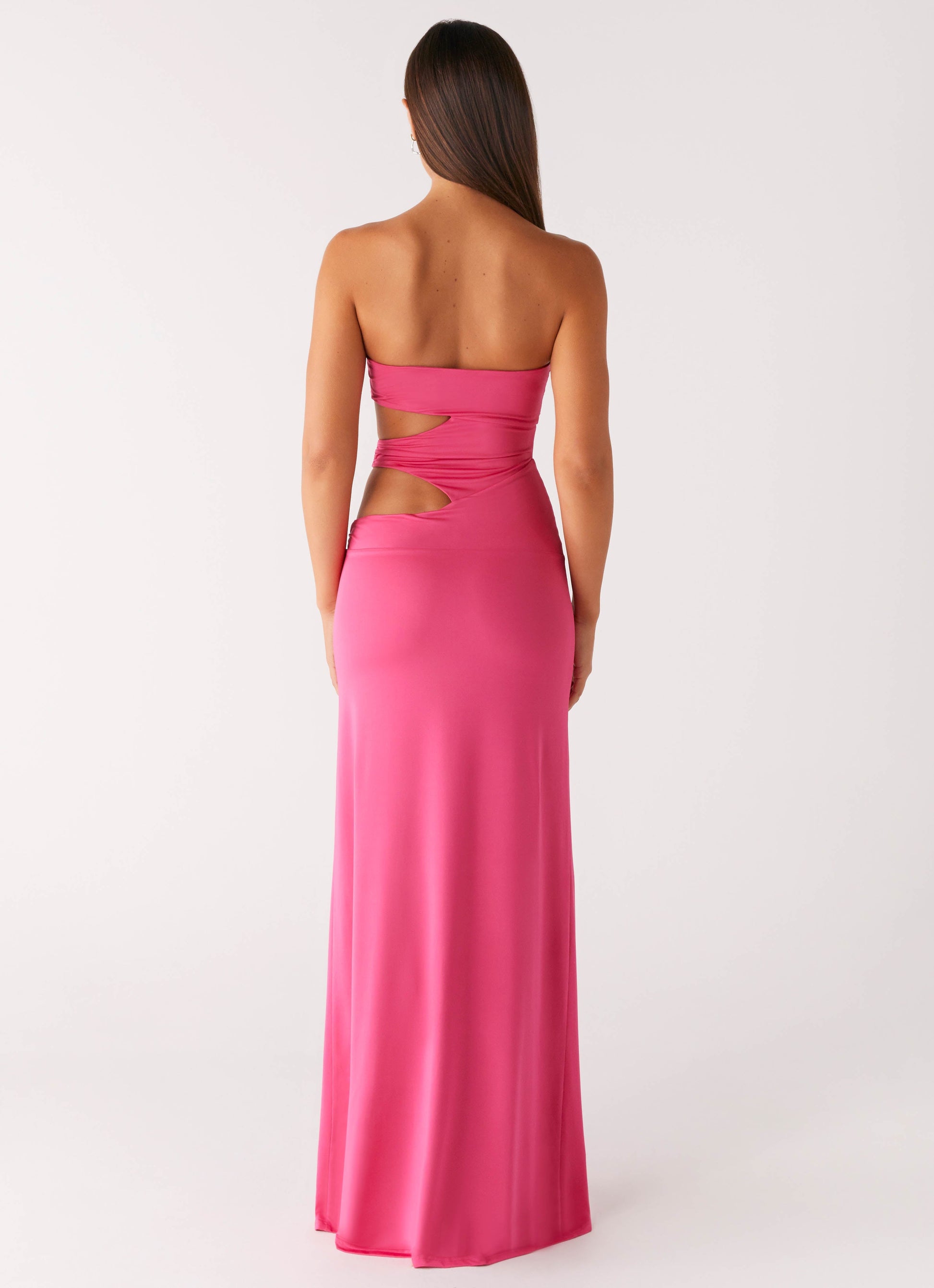 The Montego Maxi Dress in pink is a stunning strapless piece designed to turn heads. Featuring daring side cut outs, it perfectly balances elegance with a touch of edge. Ideal for nights when you want to shine effortlessly.