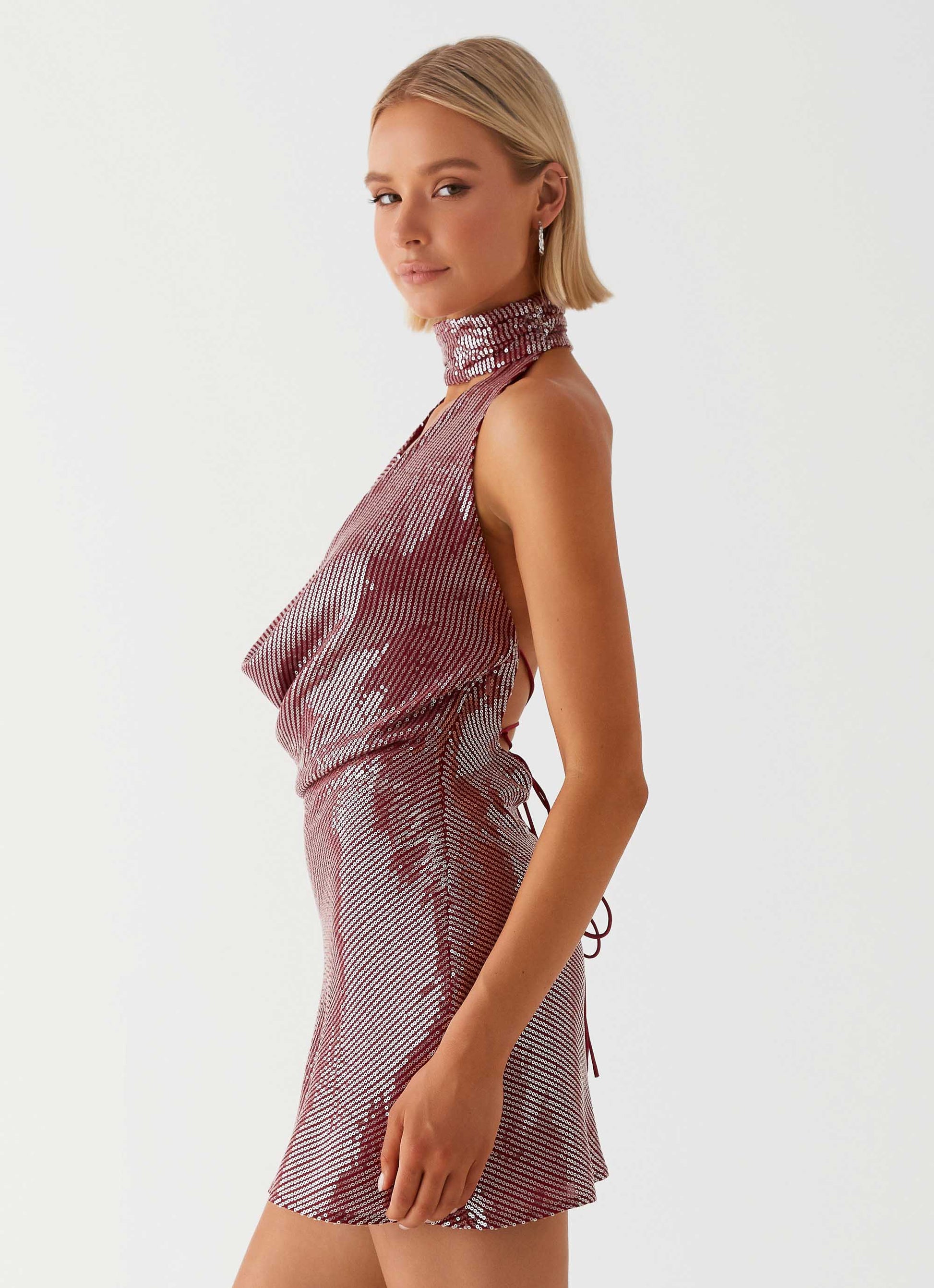Turn heads in the Nora Sequin Cowl Neck Mini Dress. Featuring a dramatic low front cowl neckline and a sultry backless design, this mini dress is perfect for making a statement. The side invisible zipper ensures a seamless fit, while the shimmering sequins catch the light with every move.