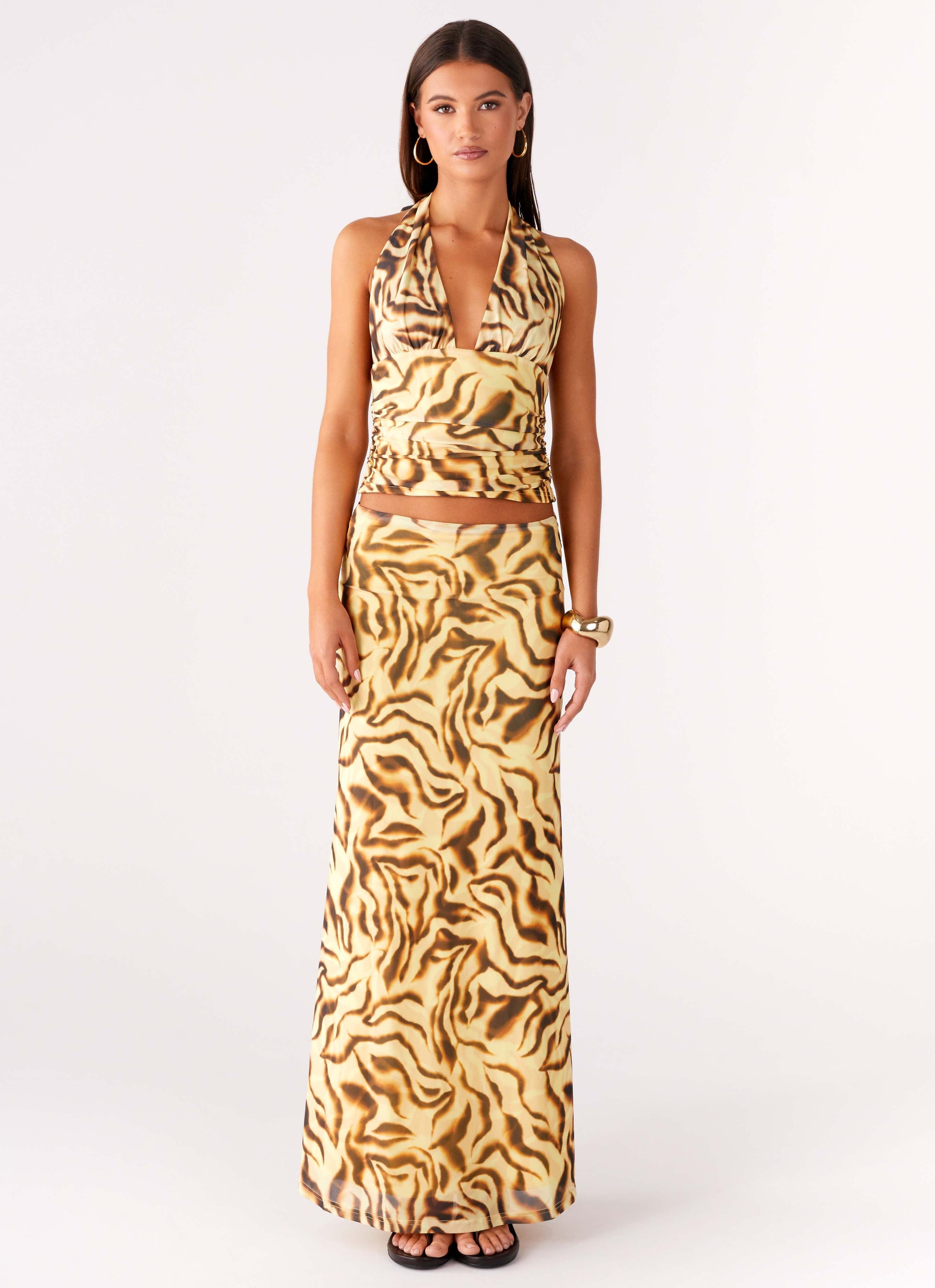 The Not My Problem Halter Neck Top is made for after-dark moments and bold moves. Featuring a halter neckline with thick neck tie strap, ruched sides and underbust, and a fully lined low back, this top shines in an exclusive print with placement that varies per garment.