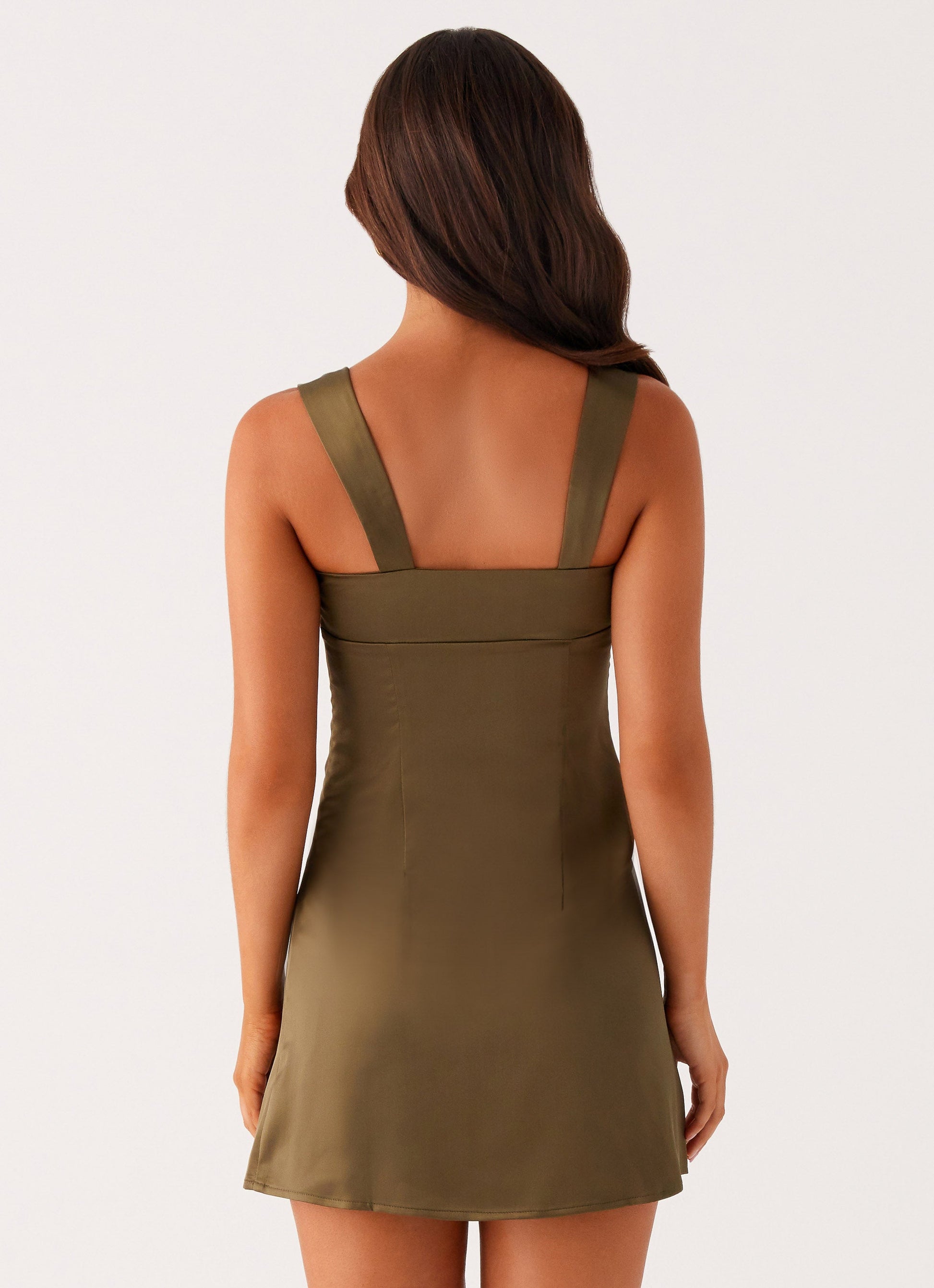 The Odette Satin Mini Dress exudes sleek sophistication. With a square neckline and figure-hugging mini length, this stretch jersey design lets you move effortlessly through balmy nights.