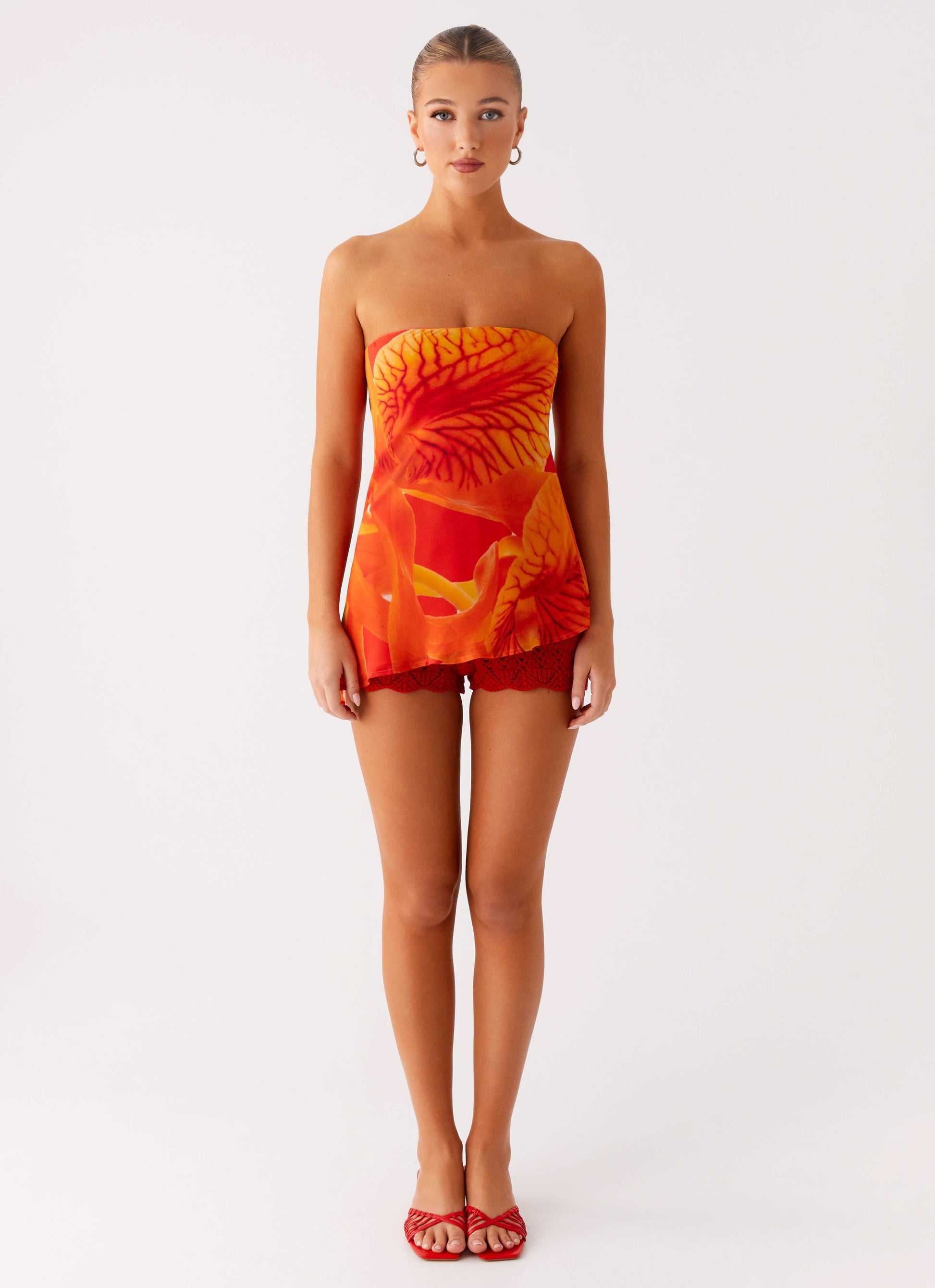 From sunset to sundown, turn heads in the Over The Horizon Asymmetrical Top. This strapless silhouette in a serene orange floral print sets the tone for balmy nights and statement moments. Designed to flatter with an asymmetrical cut that feels effortlessly bold.