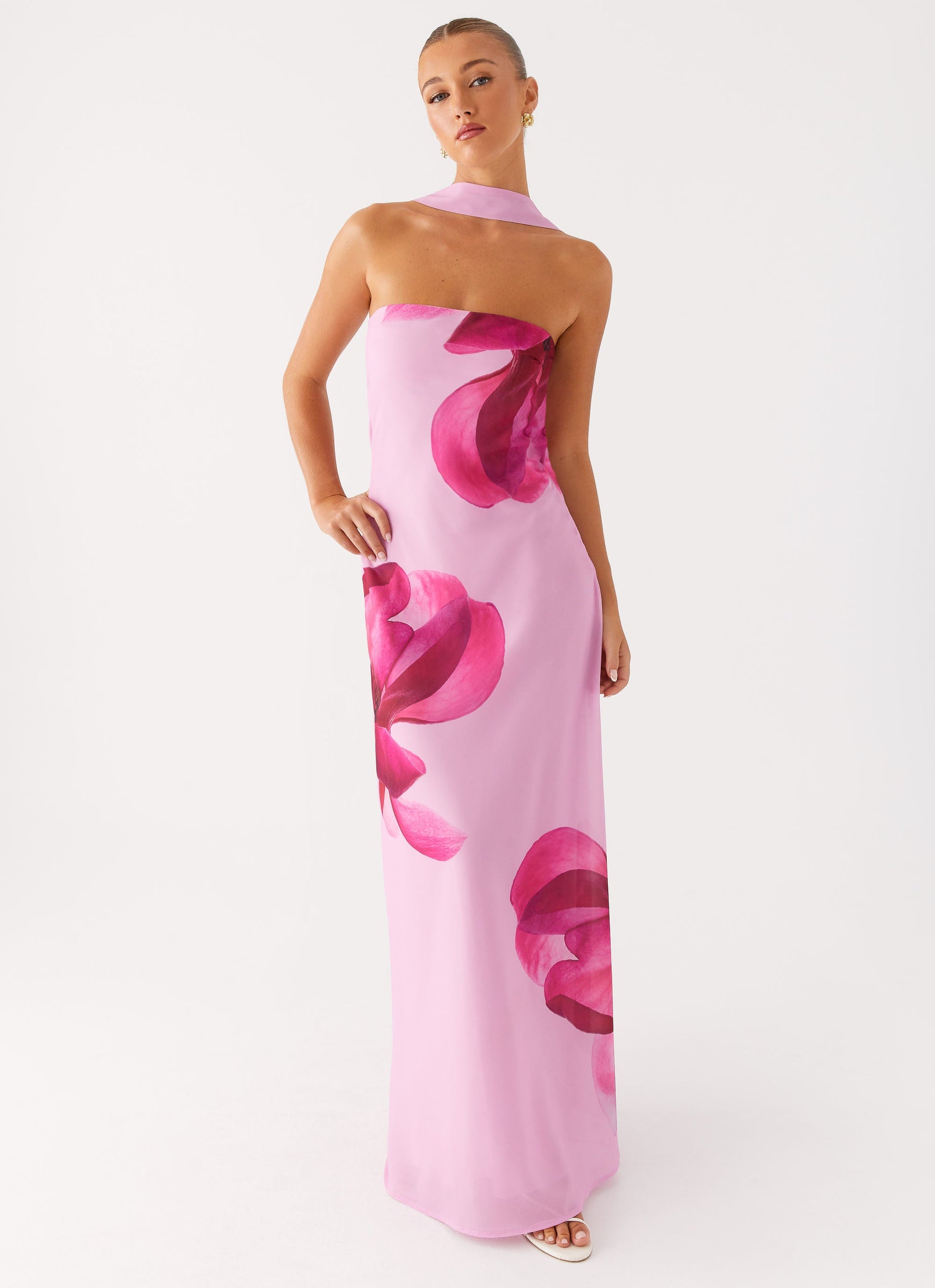Sunset siren. The Prim Maxi Dress stuns with a strapless neckline and a bold open back. Clean lines, effortless glam—this one's made for golden hour glows and nights that never end.