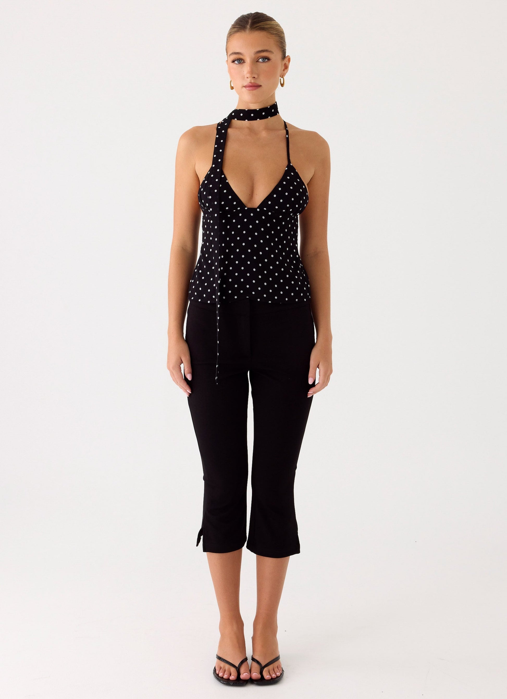 The Quiero Backless Top is a chic and playful piece featuring a classic polka dot print and flattering V neckline. With scarf-style detailing and an open back design, this lightweight top is perfect for warm days and elevated casual looks.