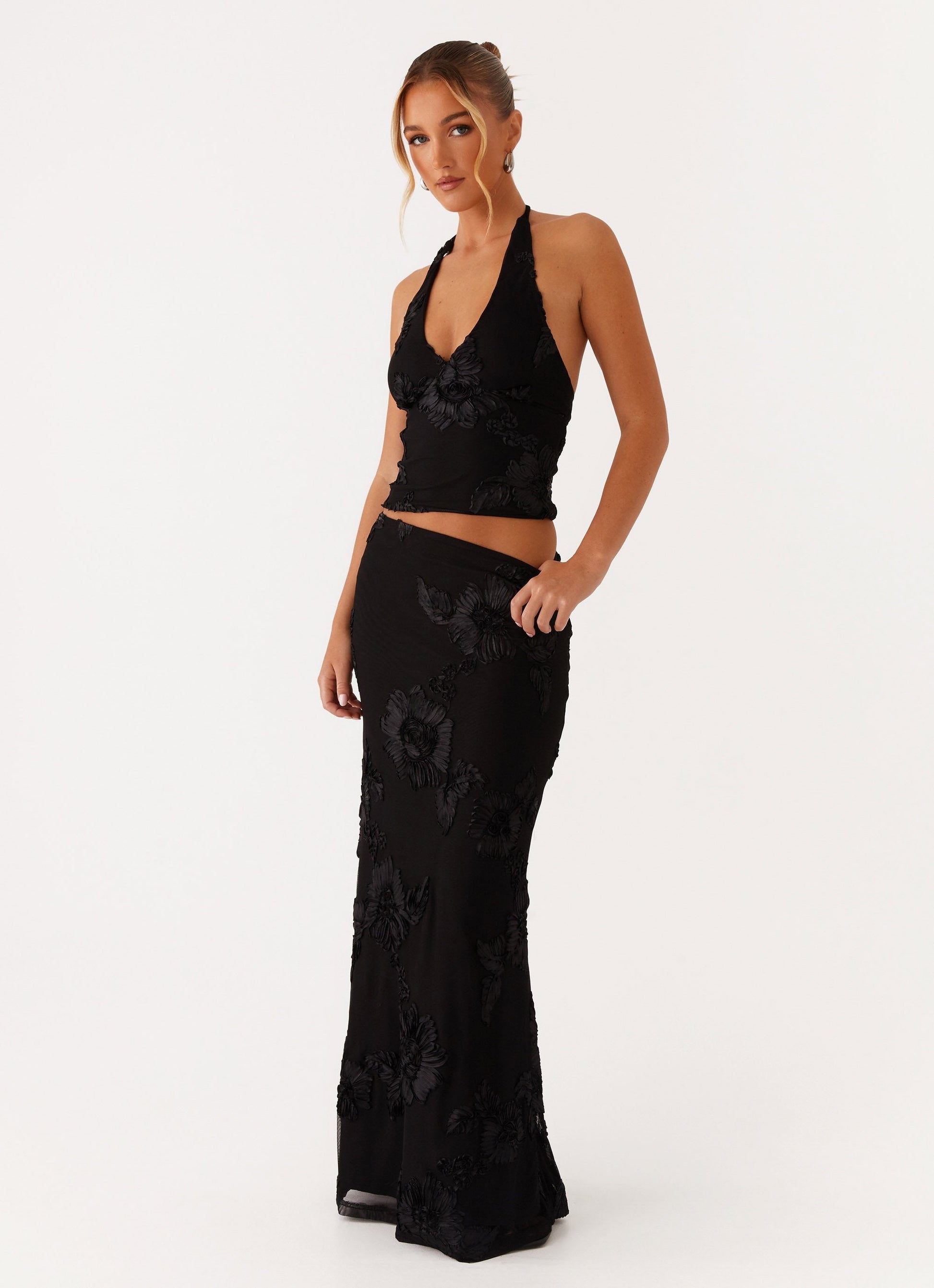 The Radiate Maxi Skirt features a low rise and a flowing maxi length, crafted from stretch mesh for a comfortable, form-fitting silhouette. This piece combines elegance with a modern edge, perfect for making a statement.