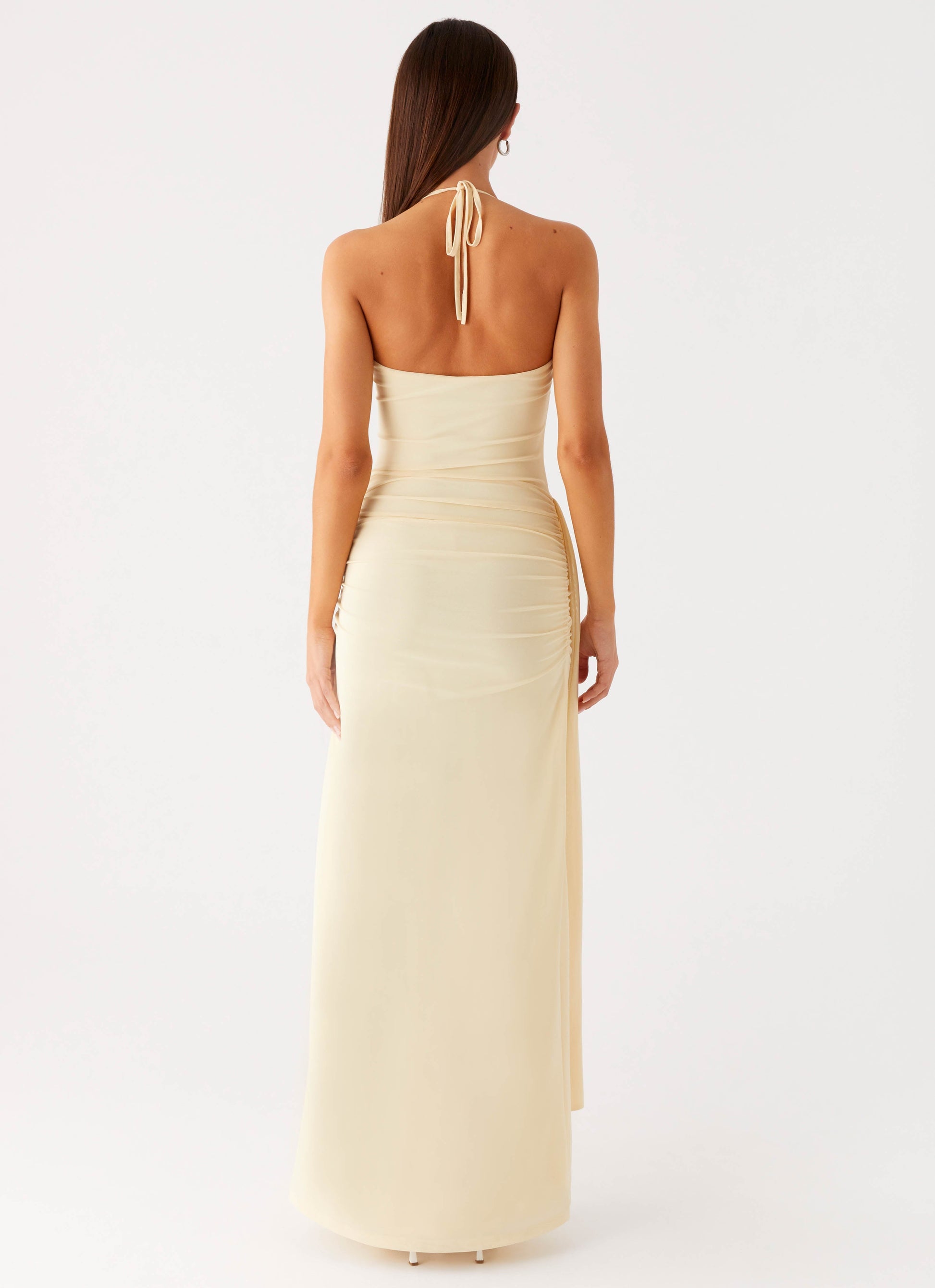 The Signal Halter Maxi Dress is your go-to for elevated evening style. Designed with a flattering v neckline, ruched bustier, and delicate thin neck tie straps. The side front tie sash adds a soft, draped detail, while the low back brings a hint of allure. Crafted from stretch mesh and fully lined for a smooth fit.