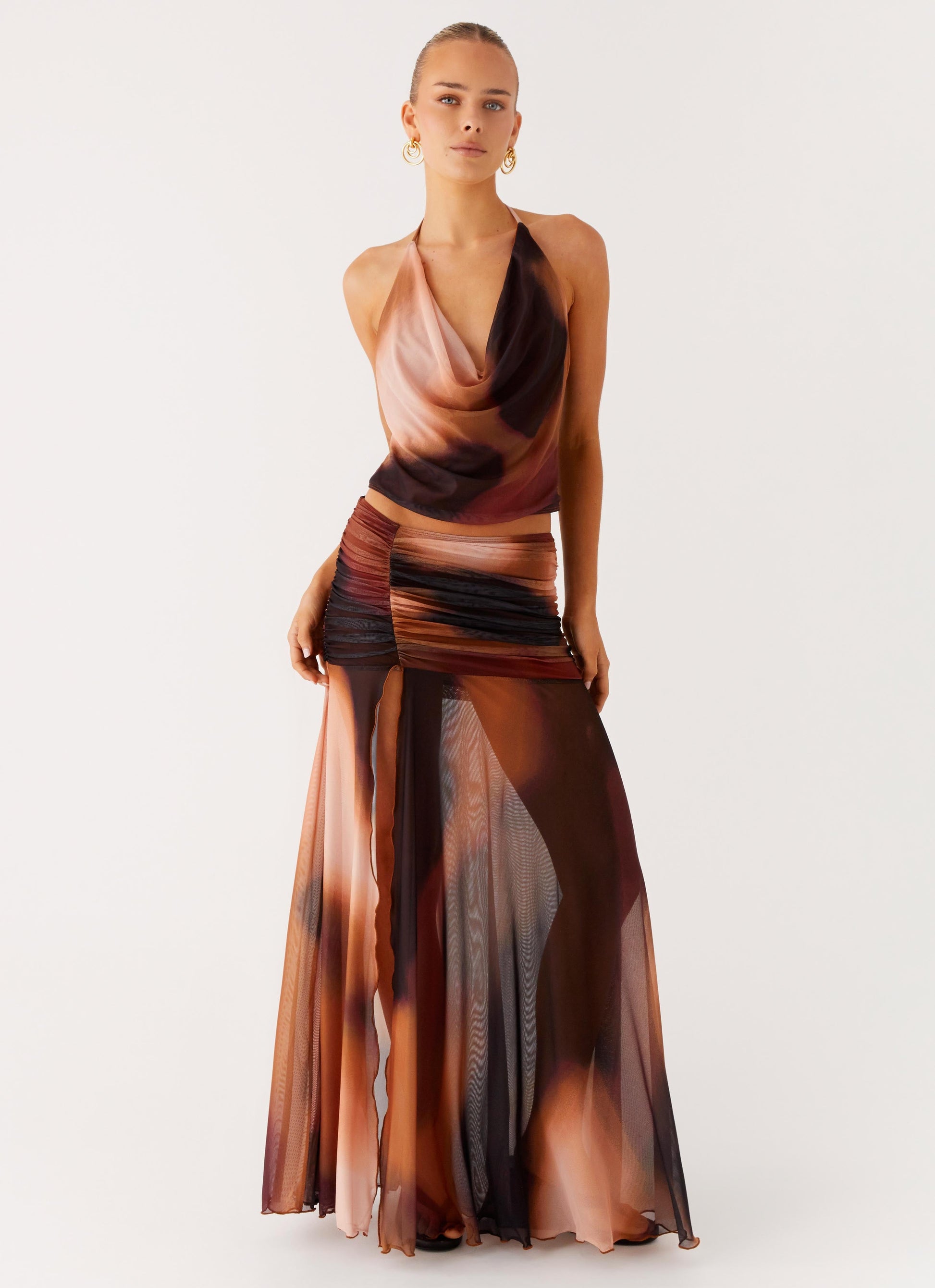 The Stargazer Mesh Cowl Top features a draped front cowl neckline and thin neck tie straps for a feminine silhouette. Crafted from stretch mesh with an exclusive print, it’s fully lined and designed with a low back for subtle allure.