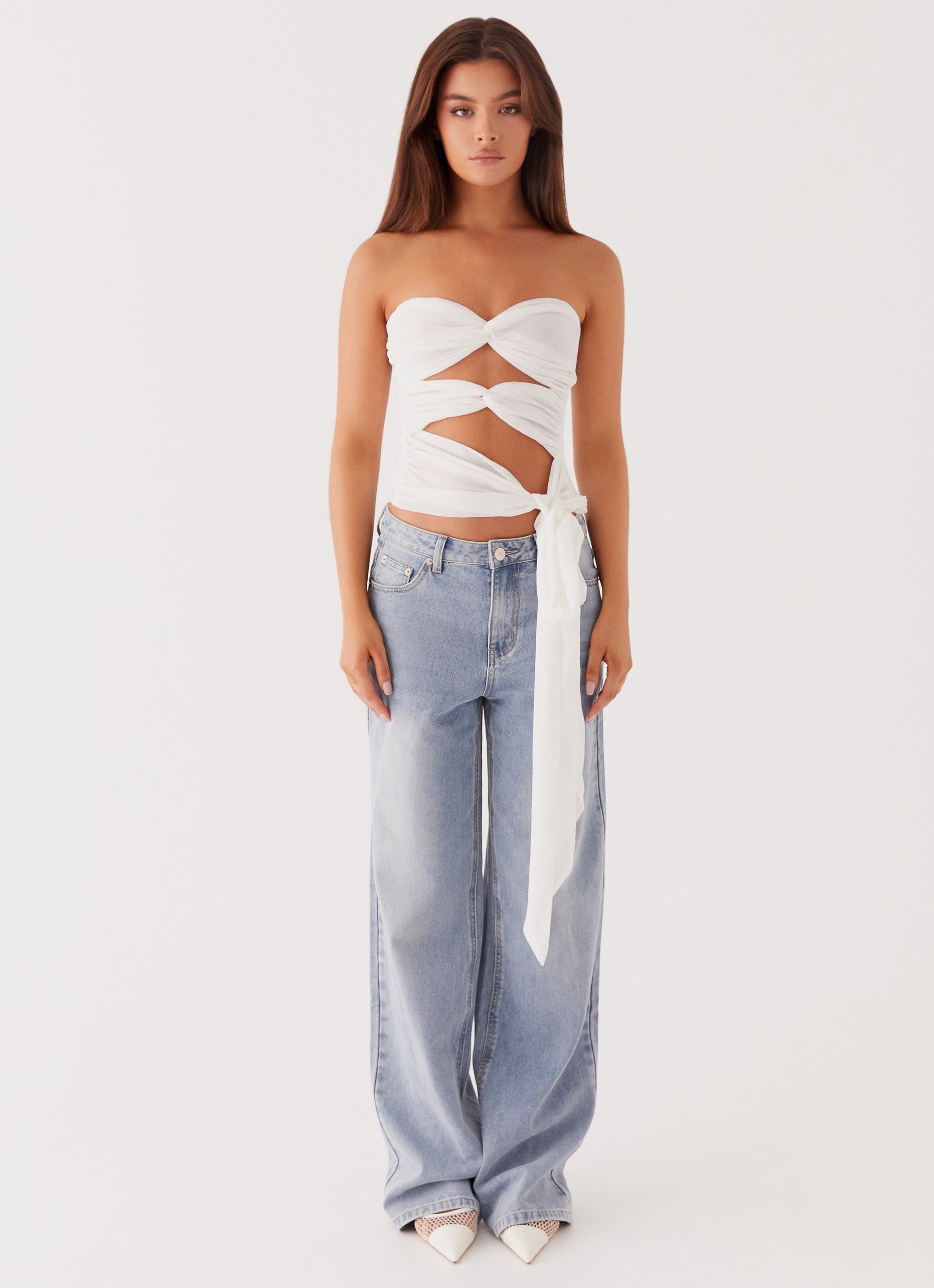 Bask in the glow of the evening sun with the Sunlight Cascade Top. Featuring a chic strapless neckline, this top exudes effortless elegance and sophistication. The two-twist panel front adds a touch of intrigue and dimension, while the front long tie detail offers a playful accent.