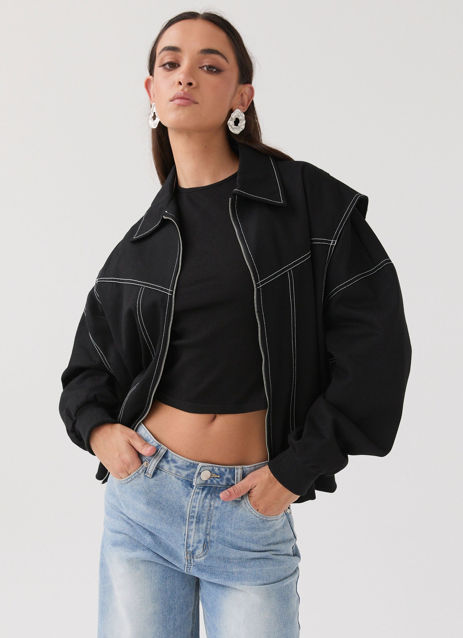 The Take The Lead Oversized Bomber Jacket, the ultimate statement piece. Crafted from durable cotton drill fabric, its oversized fit and striking white stitching create a bold and edgy look. Effortlessly embrace style and comfort with this iconic transeasonal bomber.
