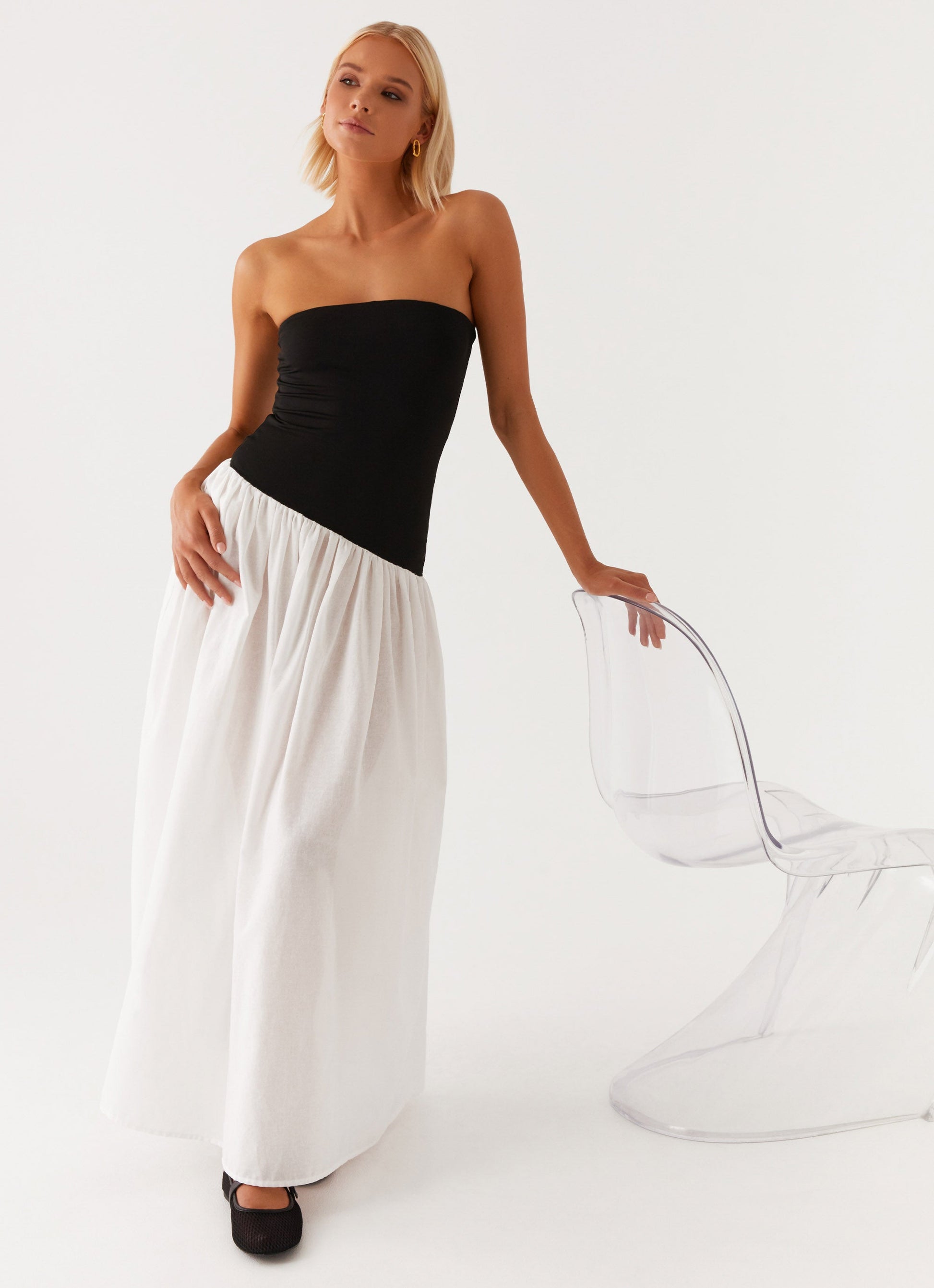 The Unstoppable Maxi Dress is a showstopper. Featuring a strapless neckline that exudes elegance, paired with a cotton skirt for ultimate comfort, this dress is designed for those unforgettable golden nights.