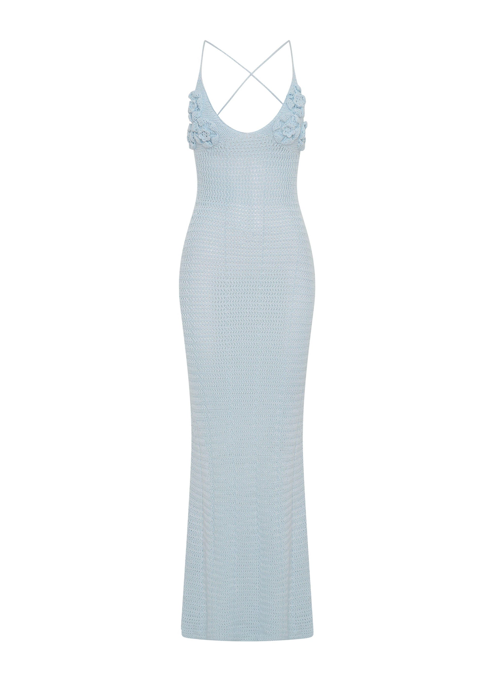 The Zara Rose Crochet Maxi Dress features a flattering V-neckline, a back tie for an adjustable fit, and a flowing maxi length. The delicate crochet fabric adds a touch of texture, perfect for a relaxed yet chic look.